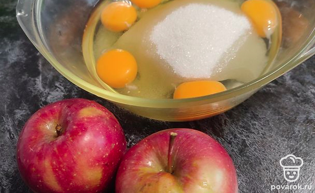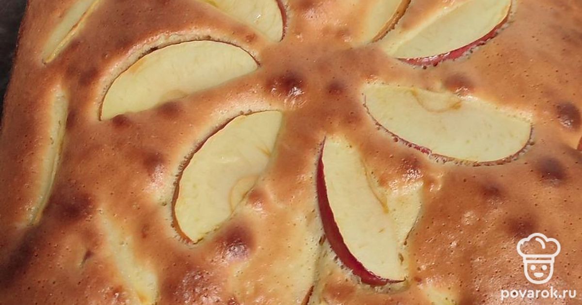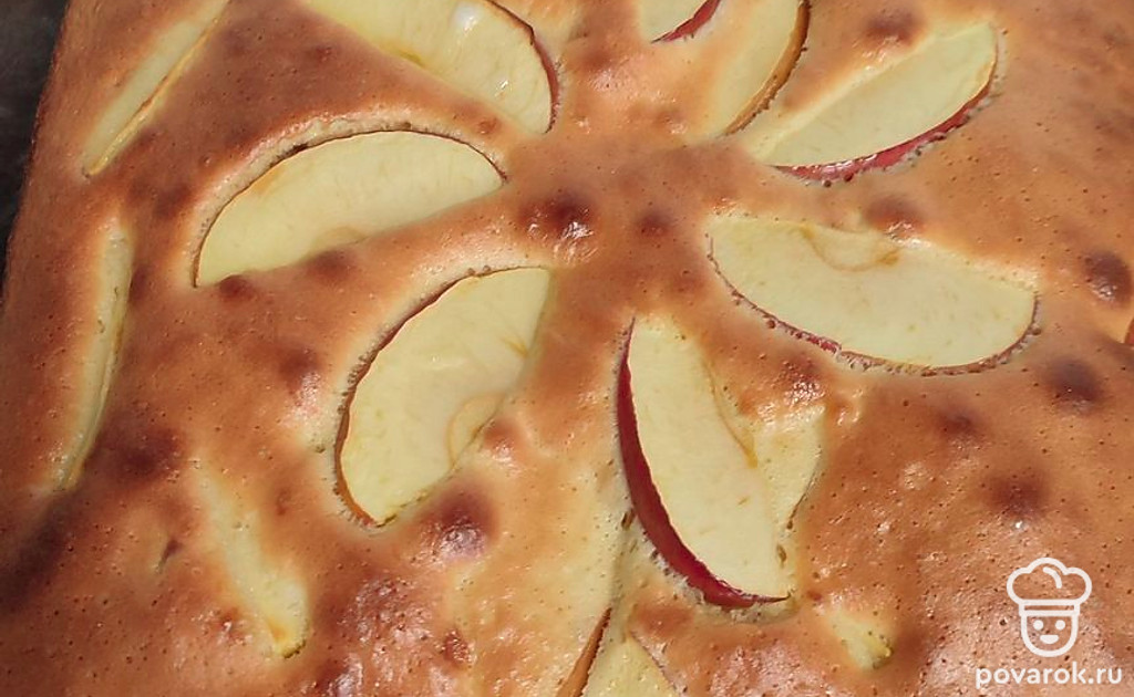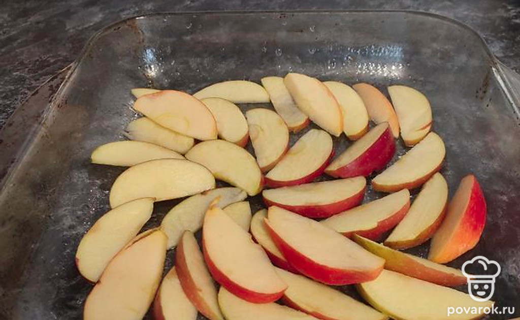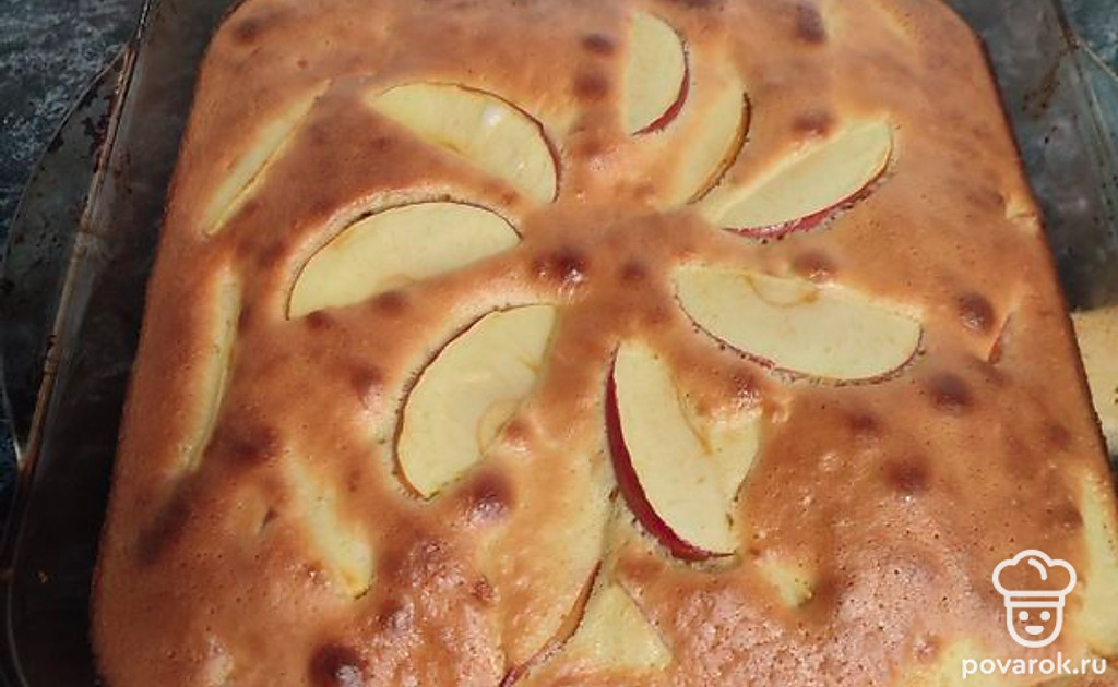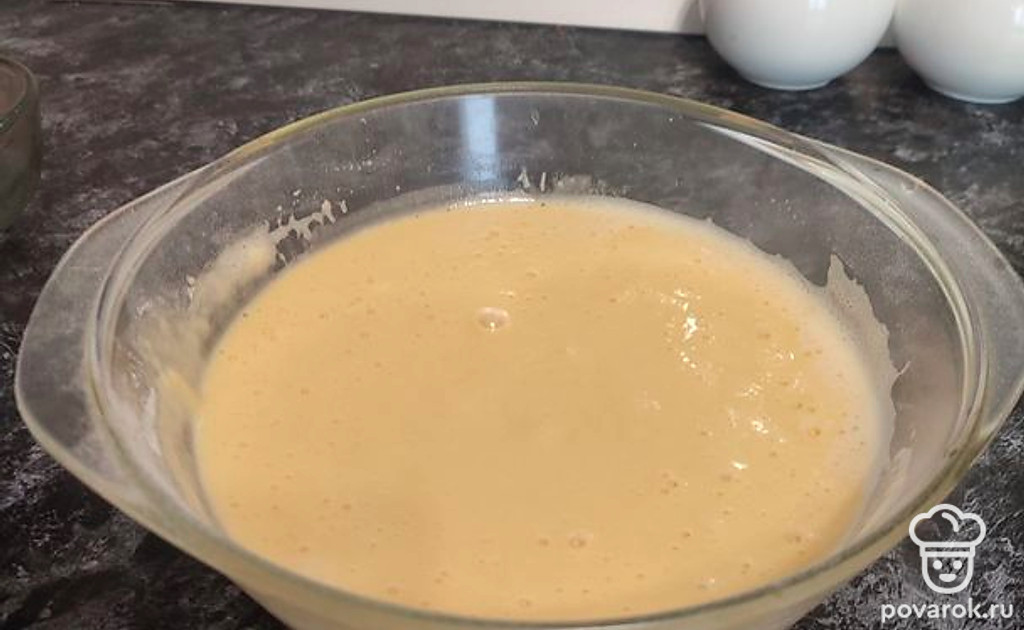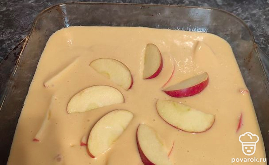 Залить фрукты тестом. Выпекать в духовке до готовности.