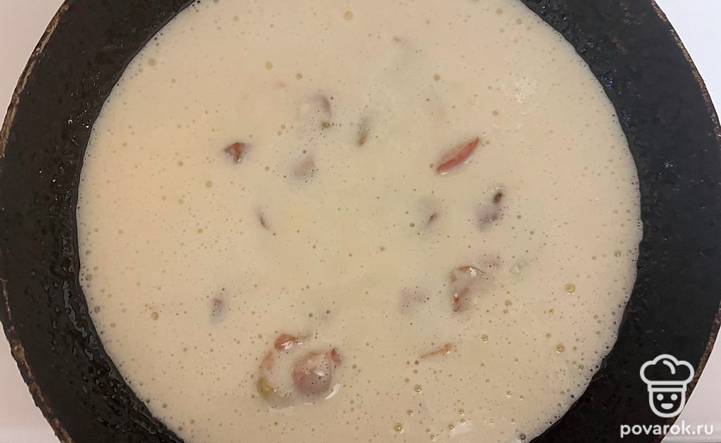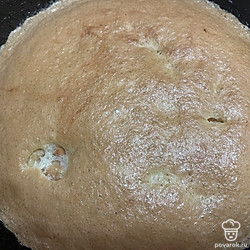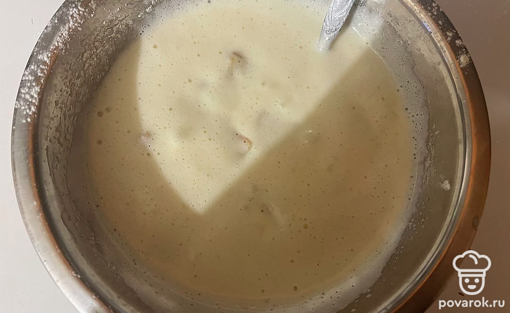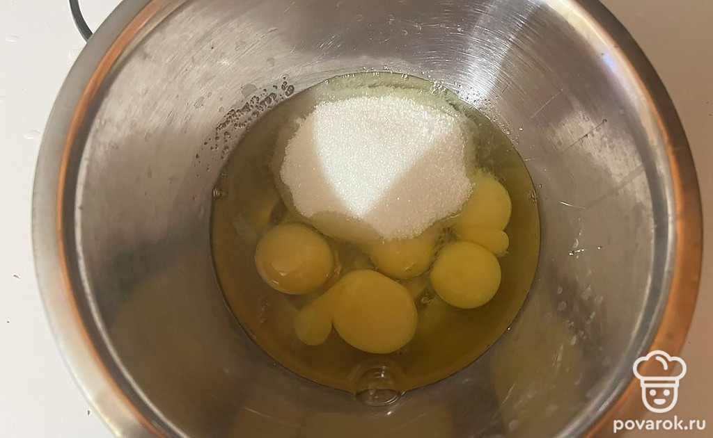 Яйца взбейте до пышной пены. К яичный смеси добавьте муку и разрыхлитель. Аккуратно замешайте тесто.