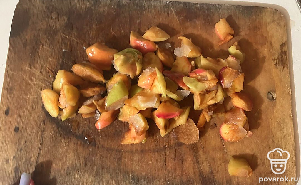 Затем к тесту добавьте 1 столовую ложку растительного масла и нарезанные яблоки. Все ингредиенты перемешайте.