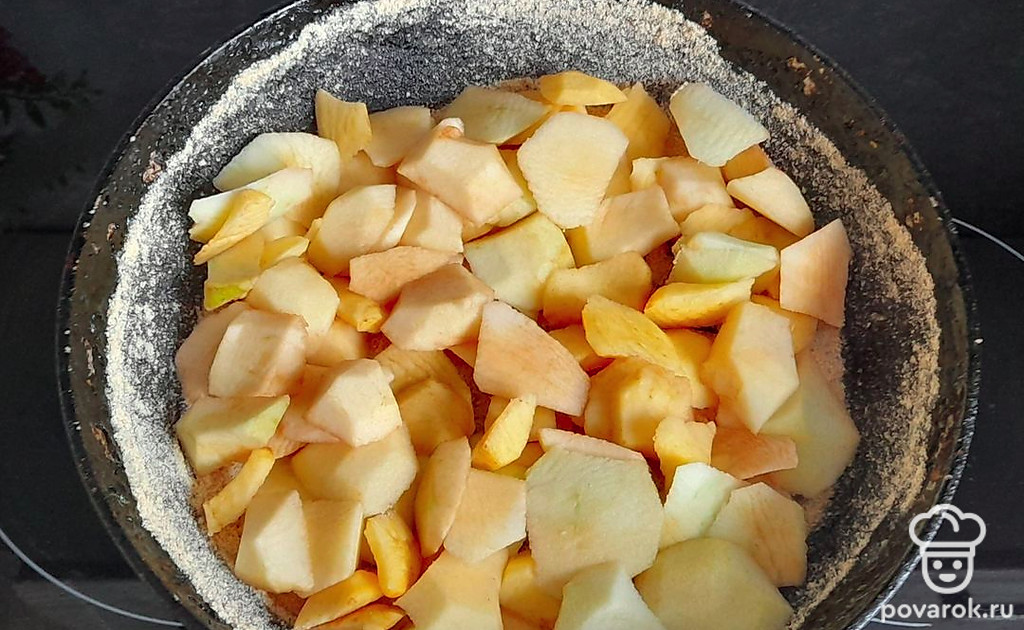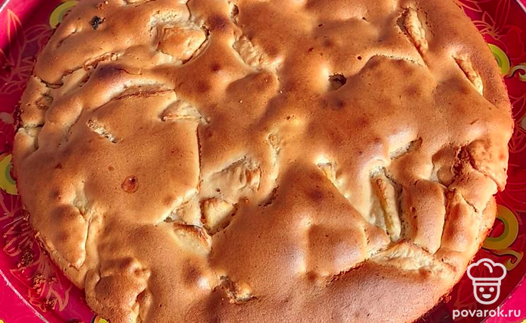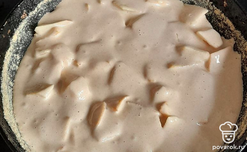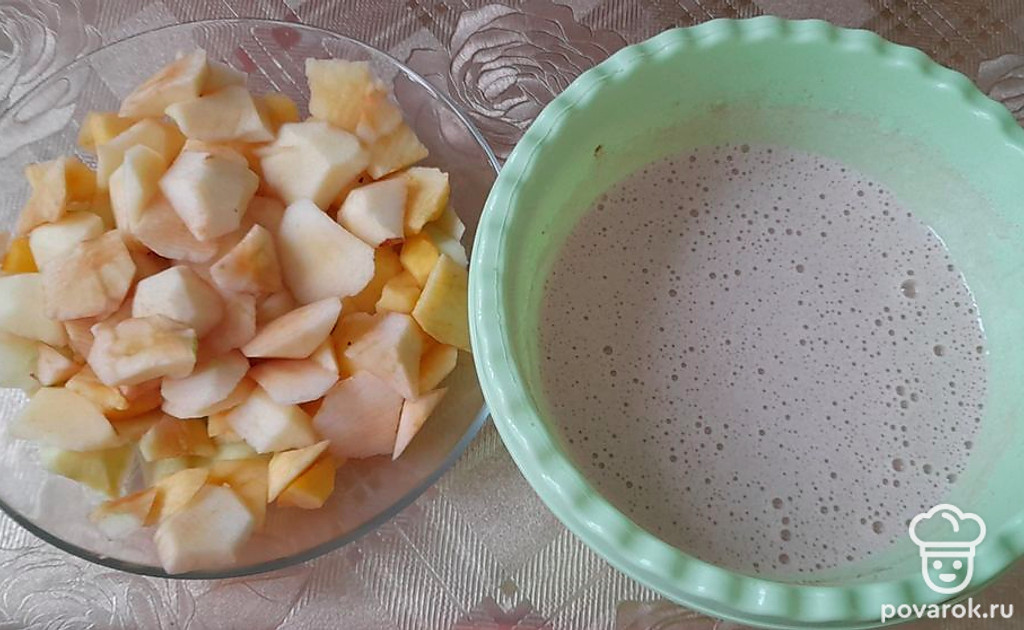 Почистить яблоки от кожуры и порезать дольками. Яйца взбить с сахаром (5 столовых ложек) до образования пены, добавить корицу или ванилин по желанию. Добавить муку. Хорошо все взбить миксером. Тесто должно получиться как на оладьи. Не сильно жидкое и не густое.