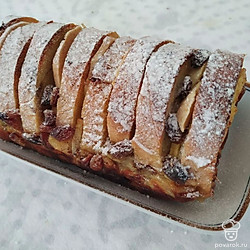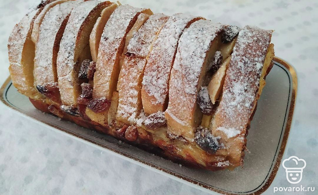 Залейте гармошку сливочно-яичной заливкой, выпекайте 20 минут до подрумянивания. Охлажденную шарлотку посыпьте сахарной пудрой.