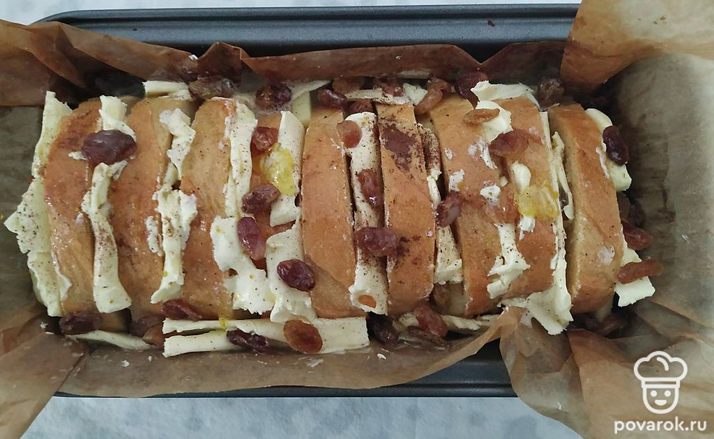 Батон нарежьте, яйца взбейте в пышную массу с сахаром, ванилином, куркумой, корицей, мускатным орехом. Влейте сливки, перемешайте. В форму с пергаментом выложите ломтики батона, между ними положите промытый изюм.
