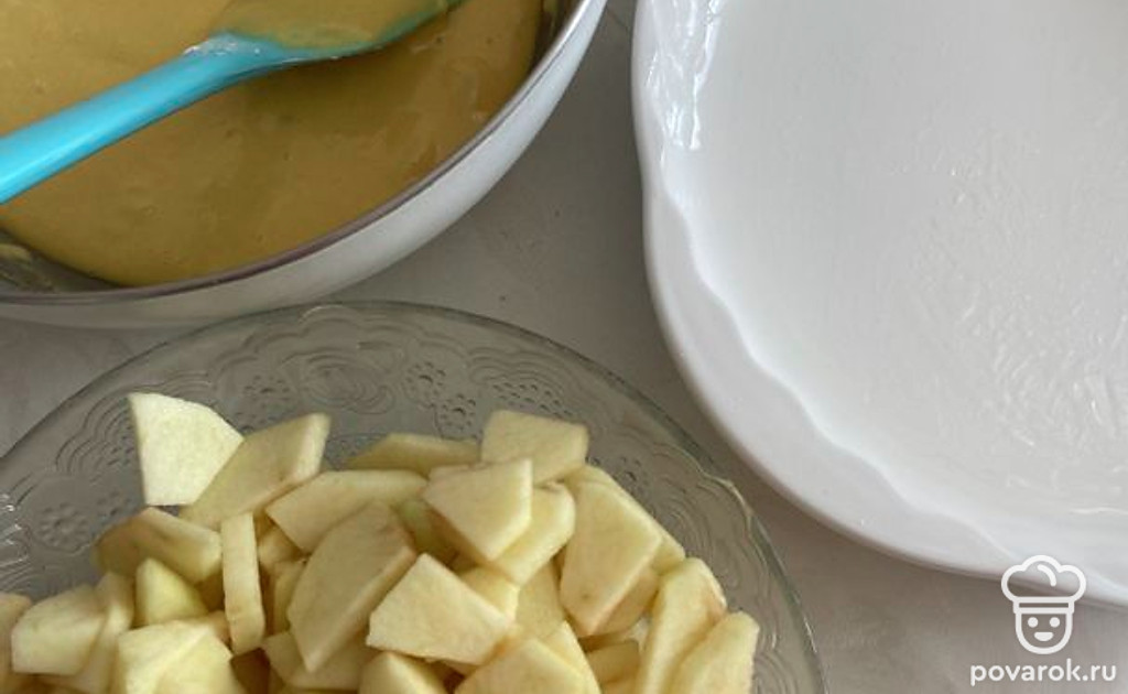 Выкладываем яблоки на дно формы, заливаем тестом, сверху украшаем яблоками. И отправим запекаться на 35-40 минут на 180 градусов.