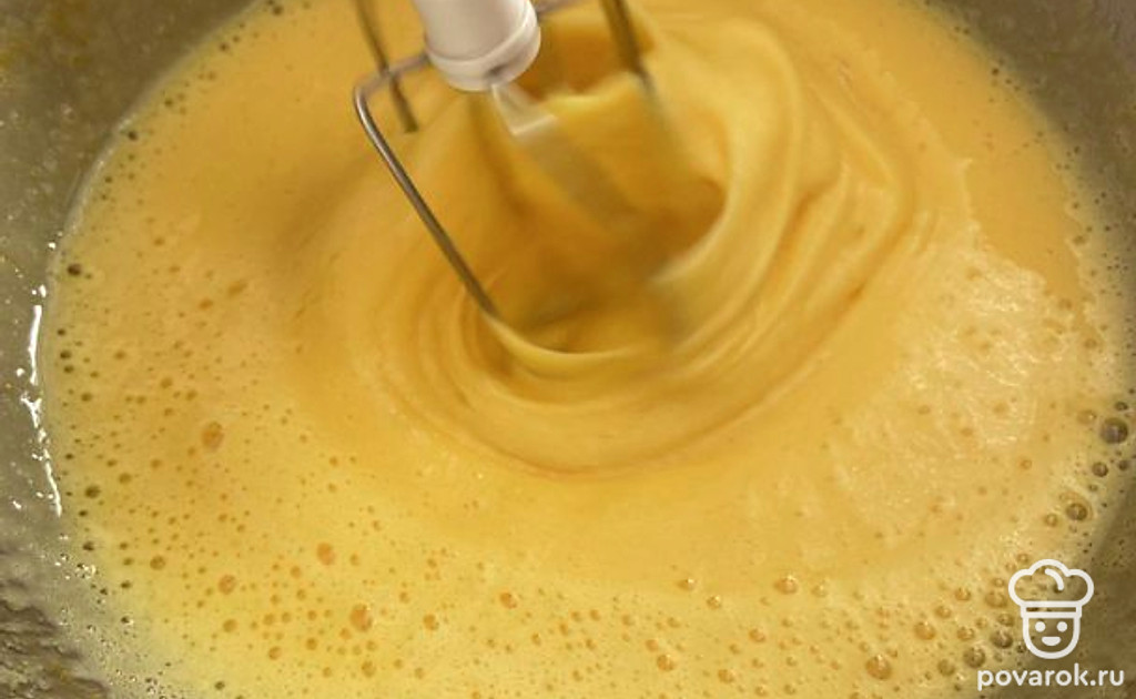 Взбиваем яйца с сахаром до пены, добавляем муку и разрыхлитель.