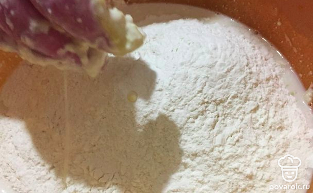 Далее все смешиваем в одну посуду. Если интересует, почему же все делается отдельно, все просто, мы ждали, когда дрожжи растворятся, вот весь секрет.