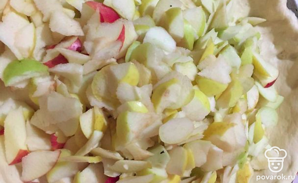 Яблочки выкладываем на тесто и раскатываем вторую часть нашего теста, она поменьше, накладываем сверху.