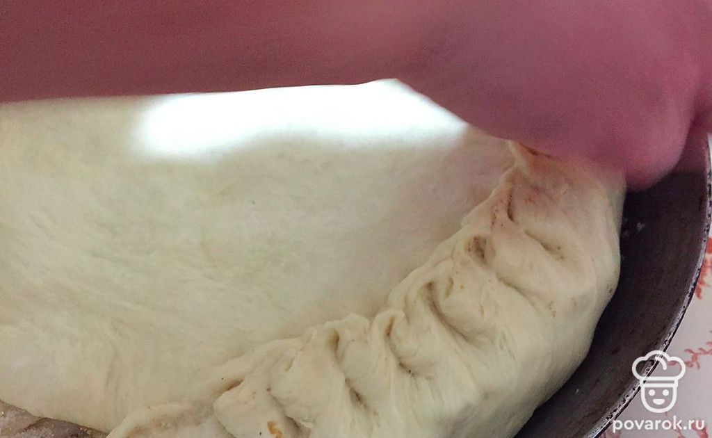 Далее от теста отделяем часть и раскатываем, смазываем форму сливочным маслом, у меня это большая сковорода, кладём наше тесто на сковороду.