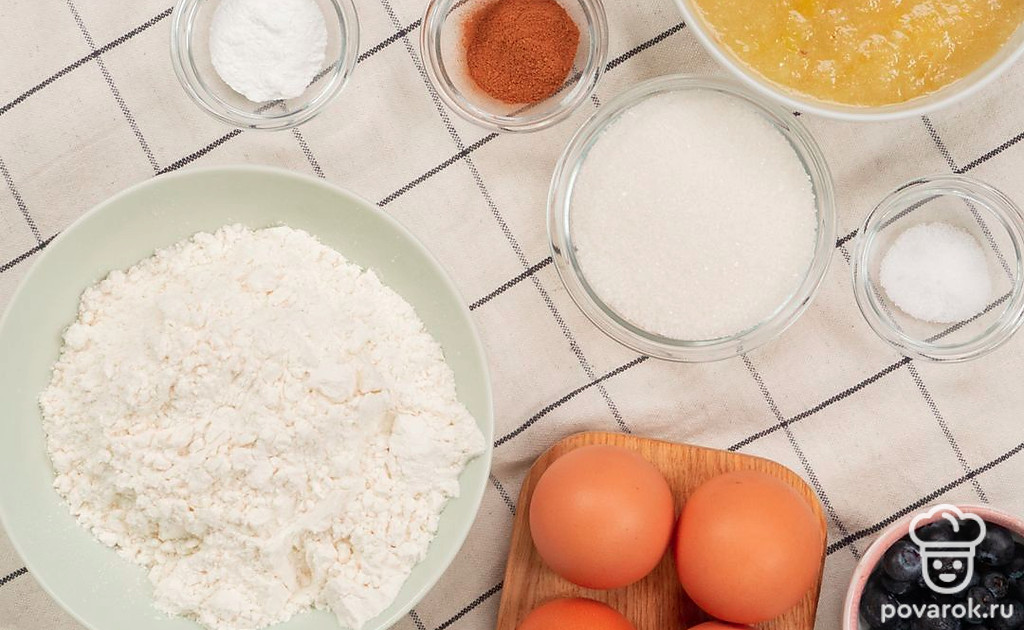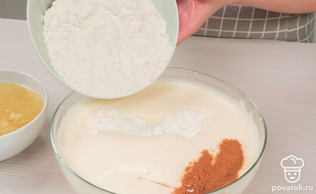 Приготовьте тесто. В миску разбейте яйца, добавьте сахар и взбивайте миксером на максимальной скорости до тех пор, пока разобьются крупинки сахара, образуется пена. Продолжая взбивать, постепенно всыпьте муку, корицу, соль и разрыхлитель. Взбивайте до тех пор, пока масса не станет однородной, без комочков.