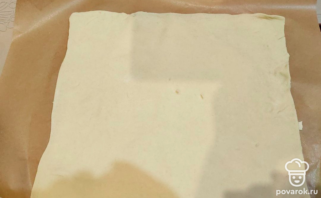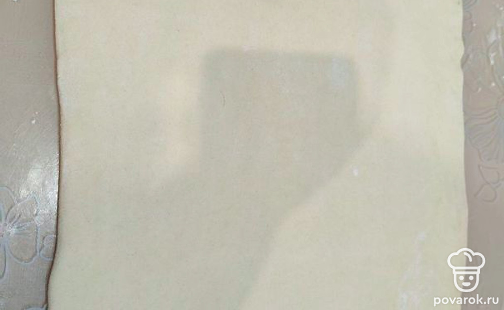 Возьмите слоеное бездрожжевое тесто (250 граммов), раскатайте в пласт толщиной 3-4 миллиметра. Придайте тесту прямоугольную форму (примерно 25 на 30 сантиметров).