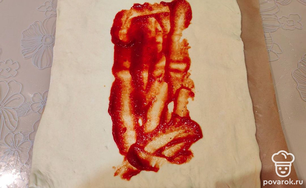 Середину смажьте 1 столовой ложкой кетчупа или красного томатного соуса.