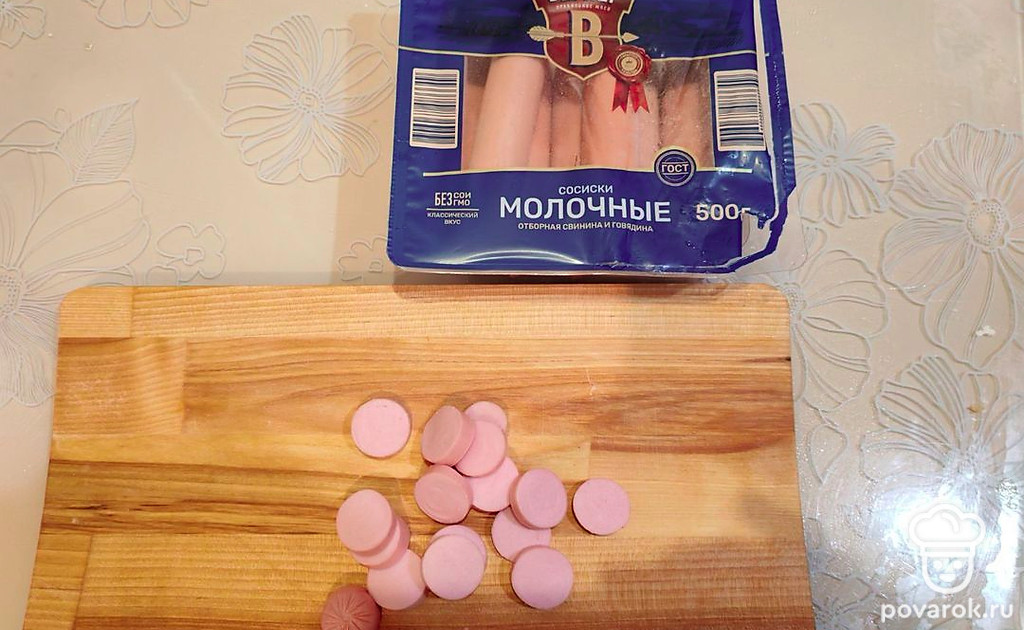 Возьмите 2 молочных сосиски, очистите от целлофана. Нарежьте тонкими кольцами.