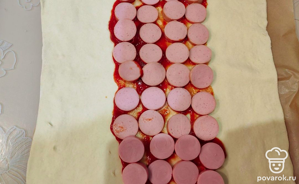 Выложите сосиски на кетчуп.