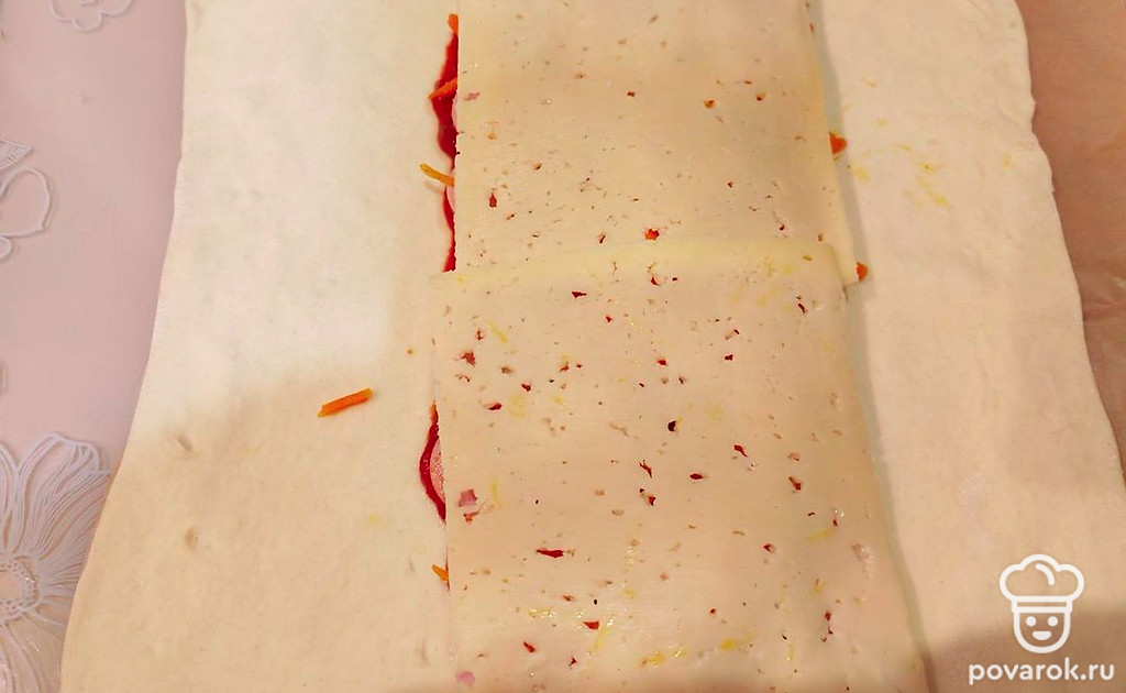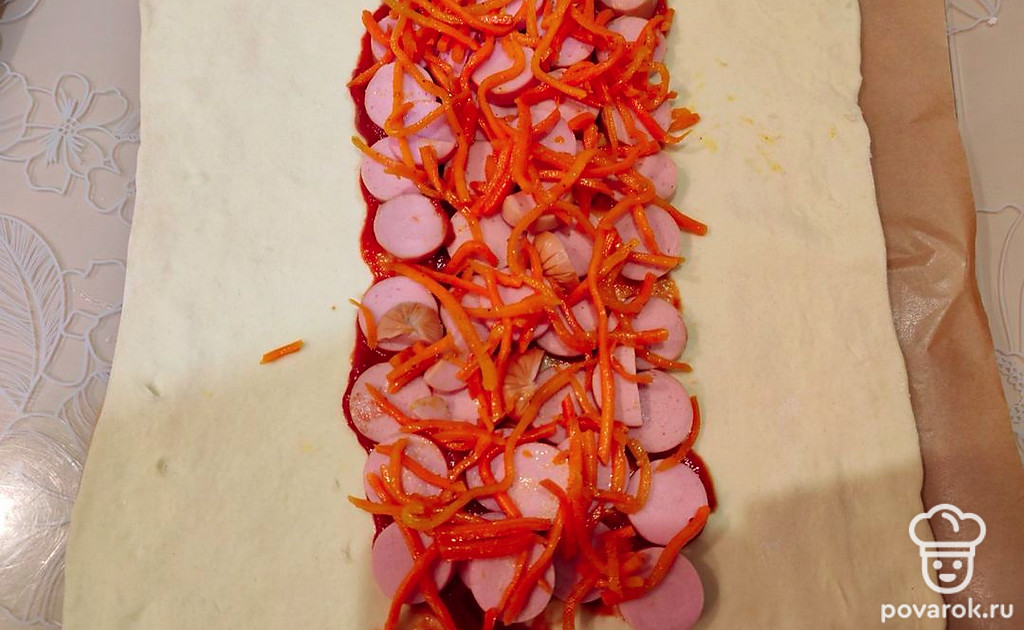 Закрытая пицца с сосисками и морковкой по-корейски