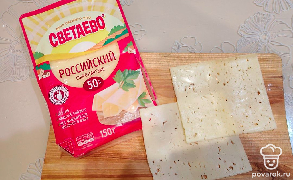 Нарежьте сыр тонкими слайсами или возьмите готовую нарезку. Нам понадобится два слайса.