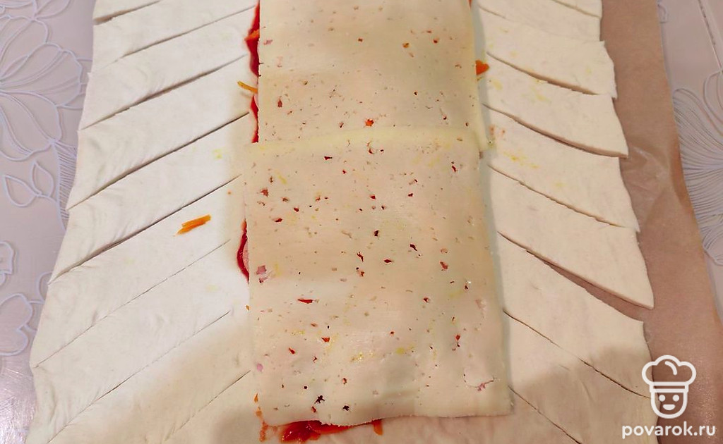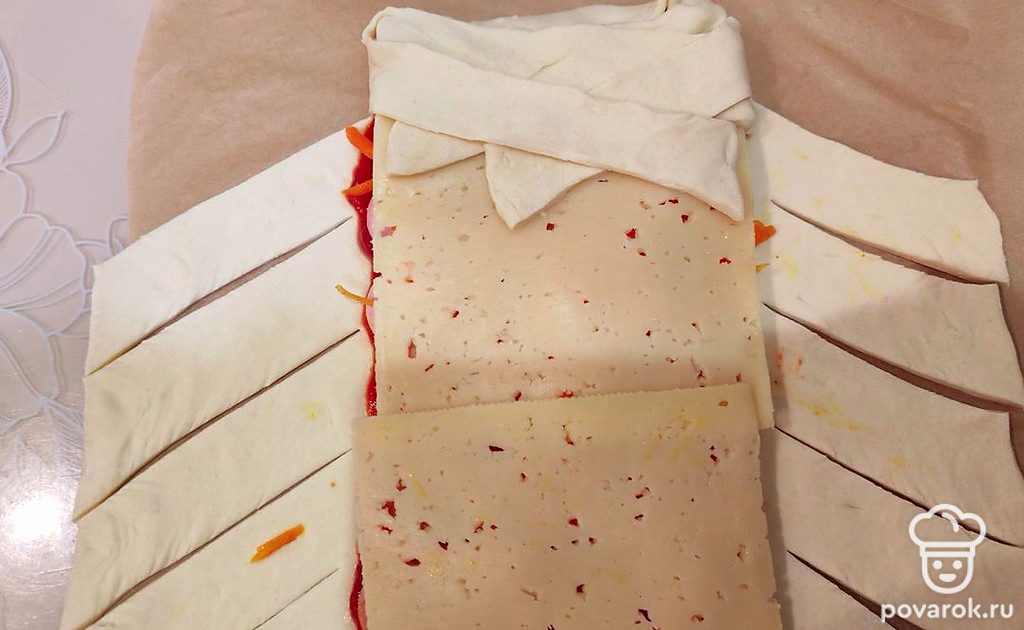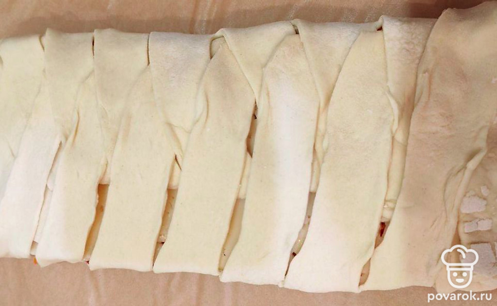 Свободные края теста нарежьте косыми полосками толщиной 1,5-2 сантиметра.