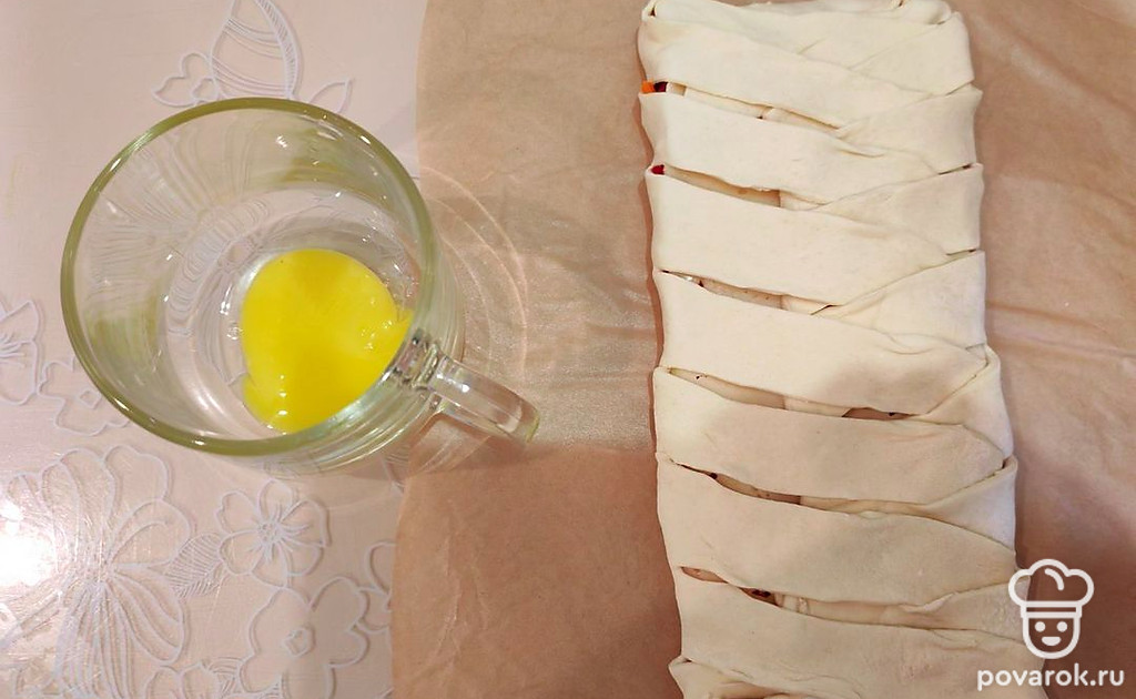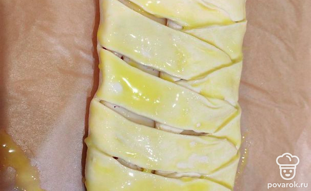 Подогните верхний край теста. Берите по одной полосе и скрещивайте их.