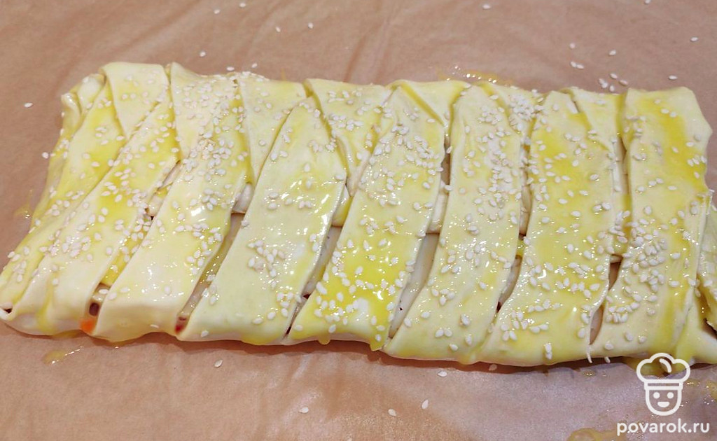 Посыпьте кунжутом. Поставьте в разогретую до 180 градусов духовку на 30 минут.