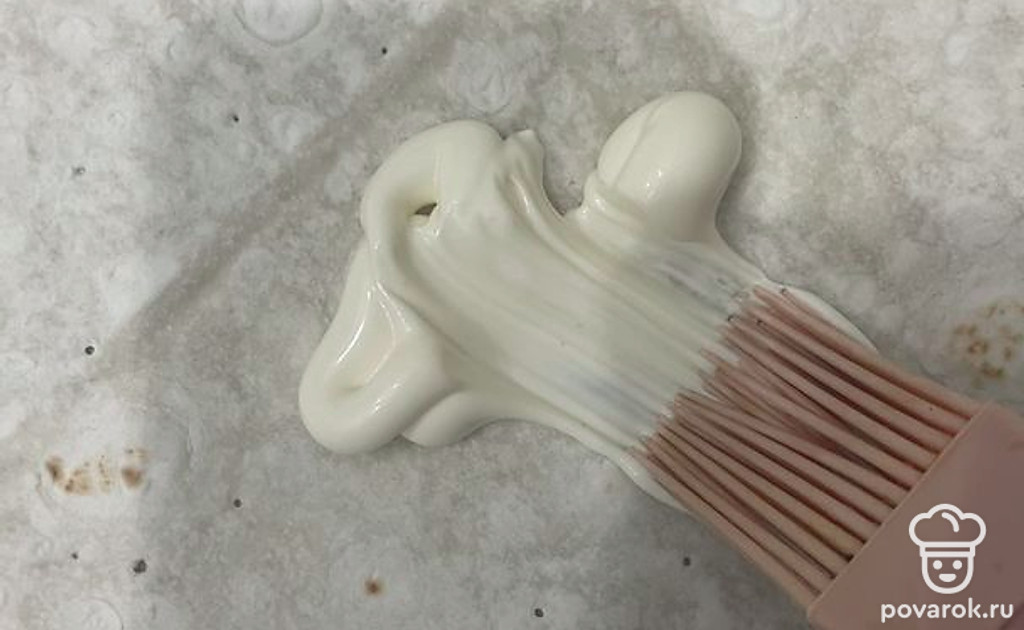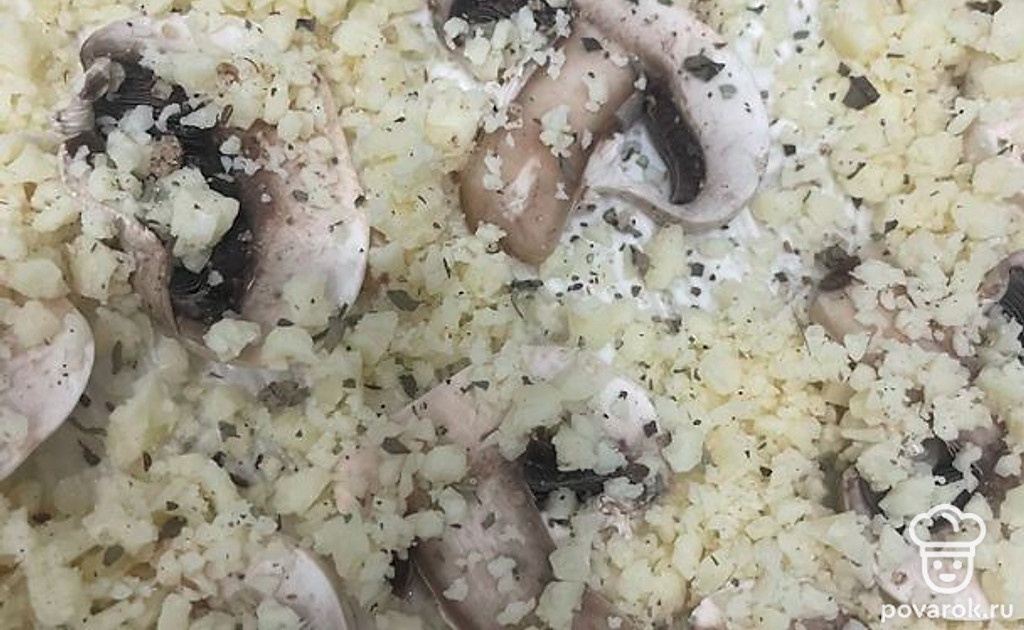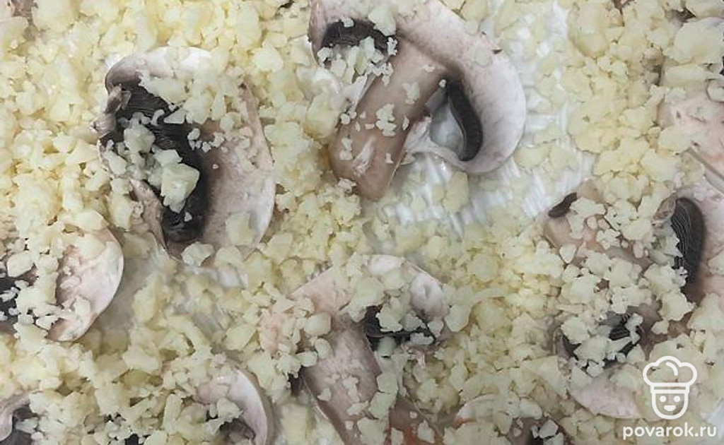 Выложите слайсы шампиньонов на майонез.