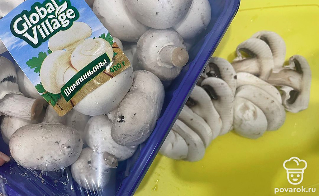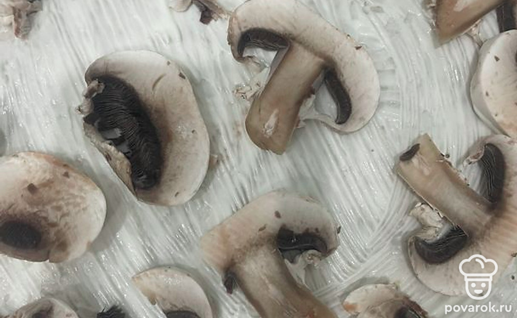 Нарежьте шампиньоны тонкими слайсами.