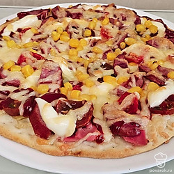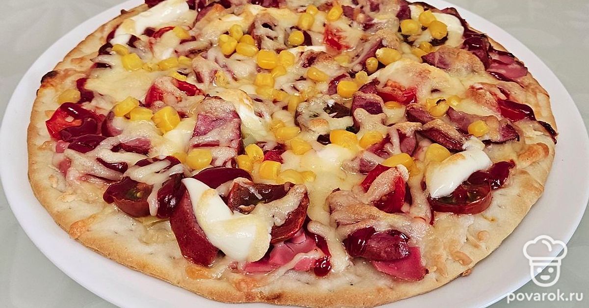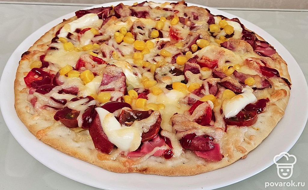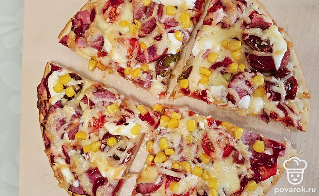 Сверху посыпьте второй частью сыра. Добавьте кукурузу. Отправьте в духовку на 8-10 минут.