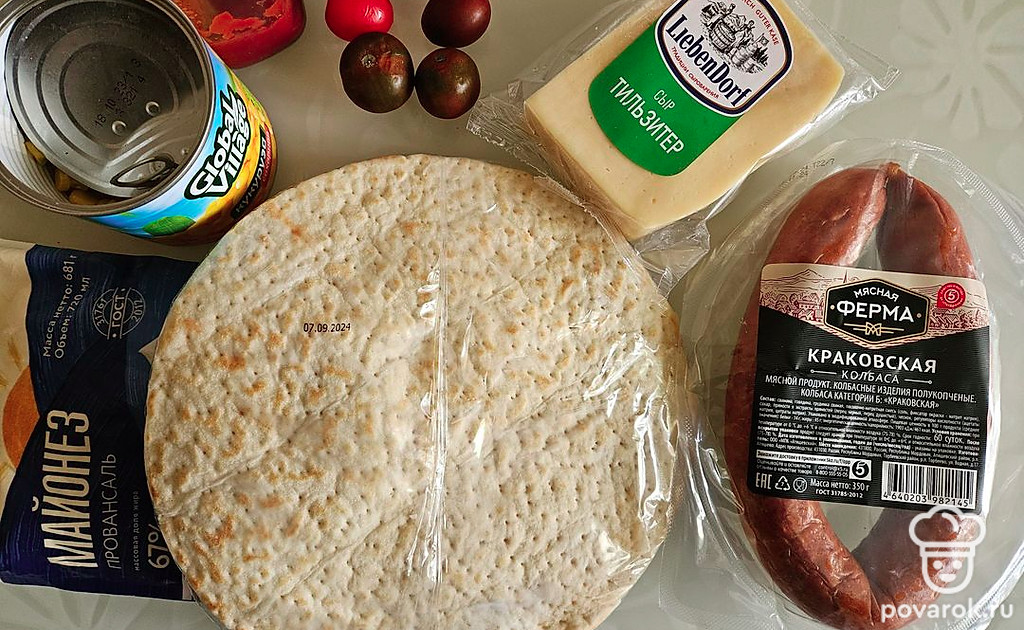 Смажьте основу для пиццы кетчупом и майонезом. Сыр натрите на крупной терке. Помидоры черри нарежьте слайсами. Колбасу нарежьте любым удобным способом.