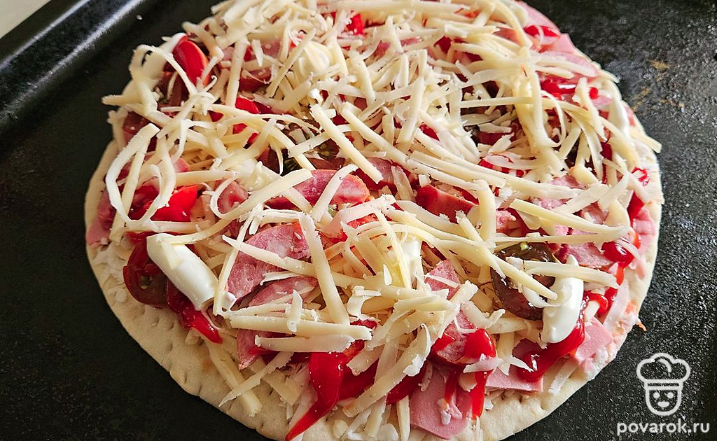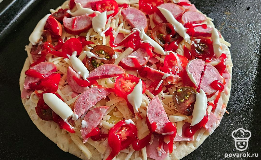 Сыр разделите на две части. Одну часть выложите на основу, затем распределите помидоры и колбасу. Для того, чтобы пицца получилась сочной, еще раз добавьте кетчуп и майонез.