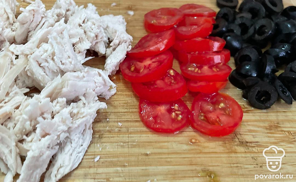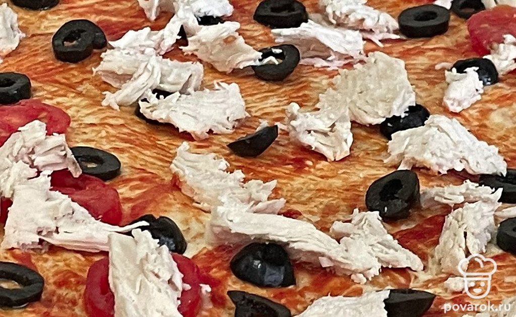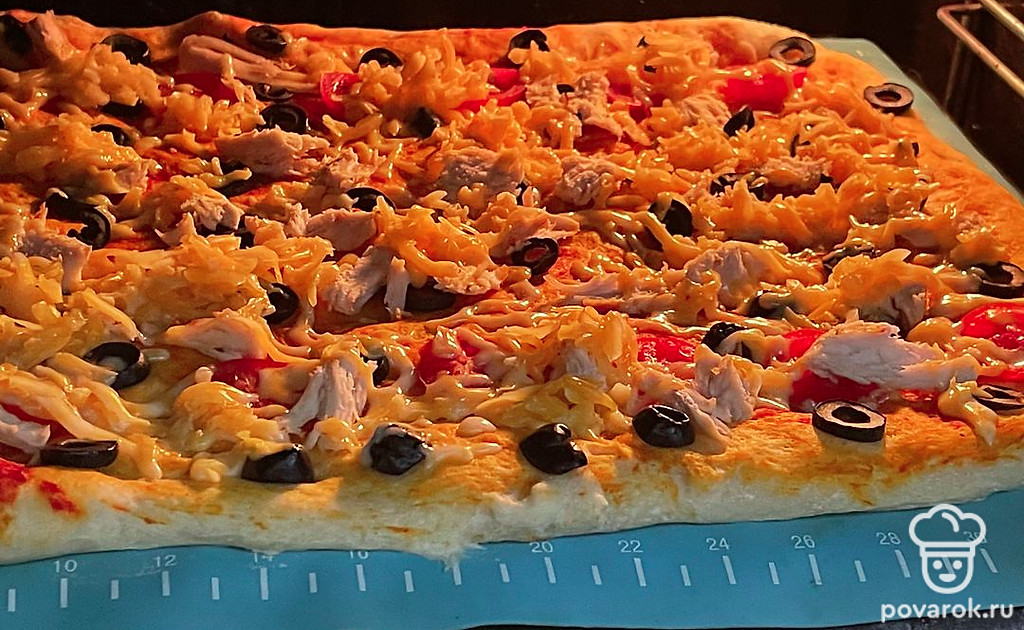 Сверху обильно посыпьте тертым сыром. Выпекайте пиццу в разогретой до 180 градусов духовке 8-10 минут.