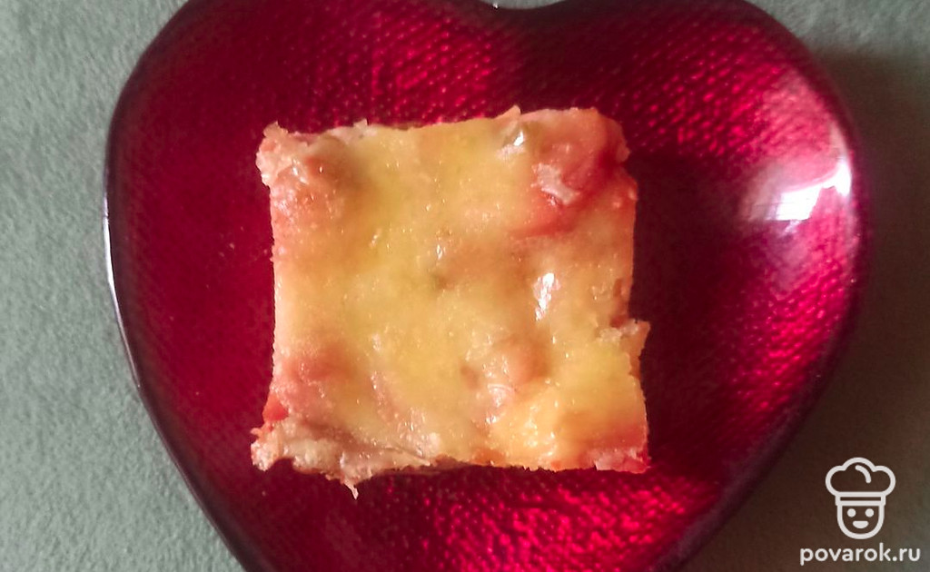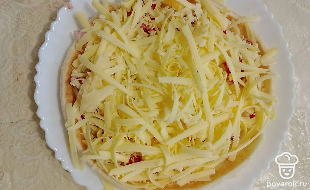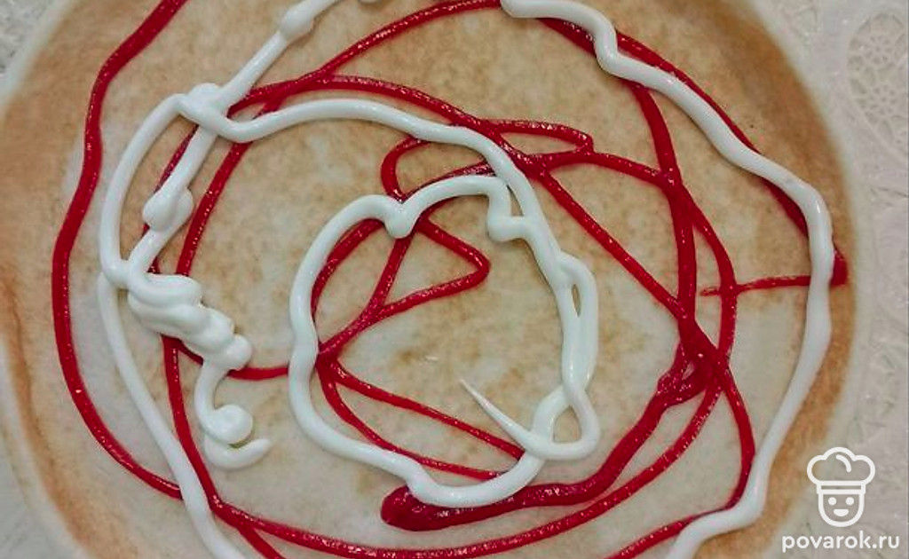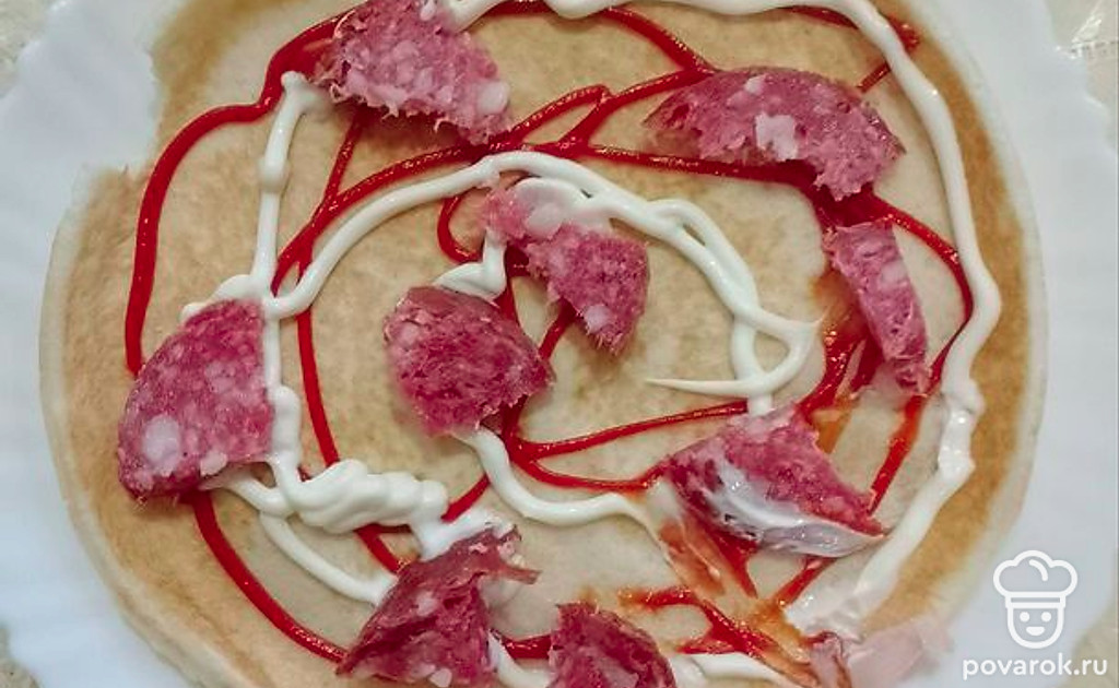 Готовый корж для пиццы смажьте томатной пастой и майонезом.