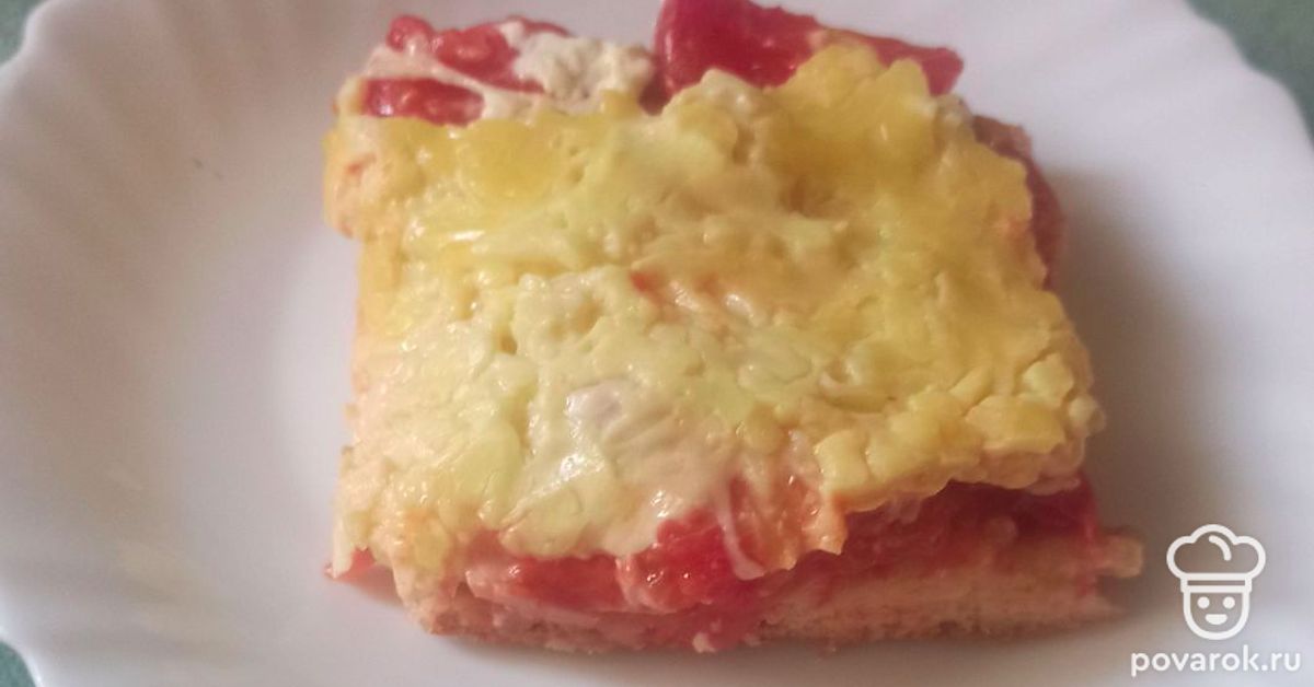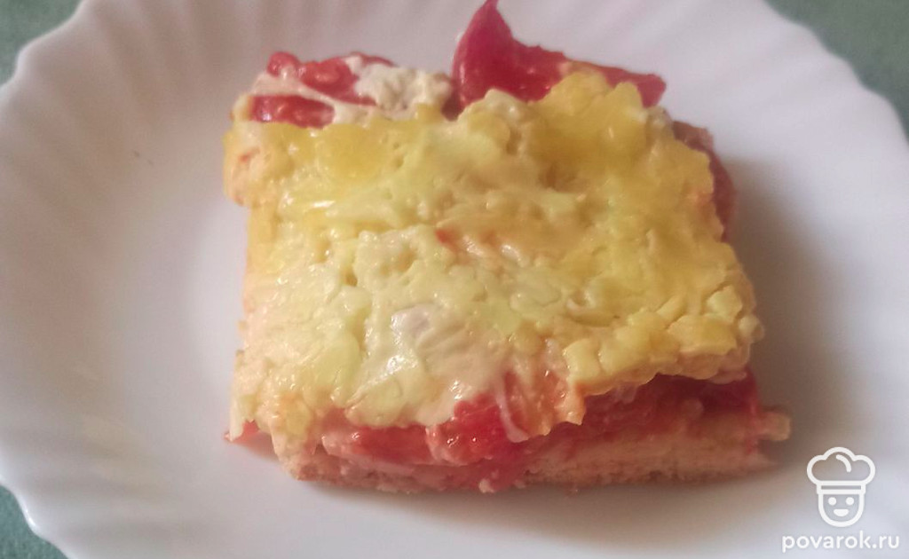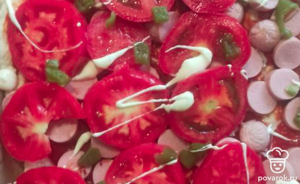 Сверху выложите нарезанные помидоры, болгарский перец и майонез.