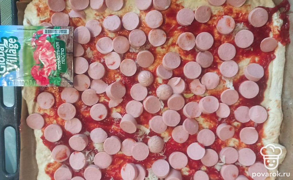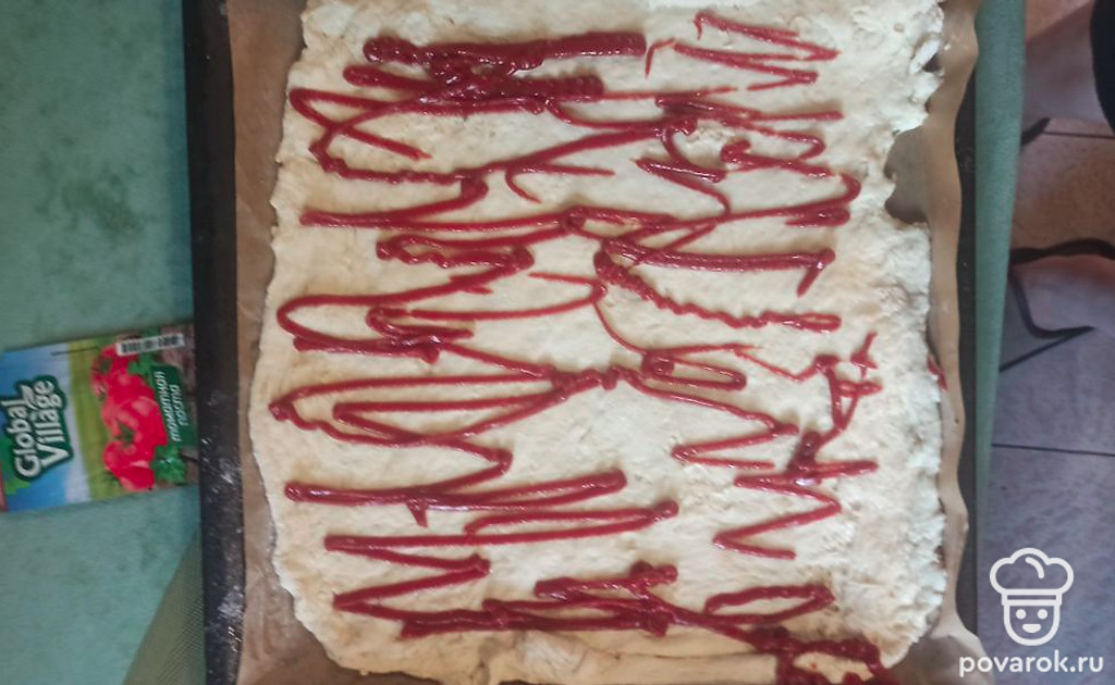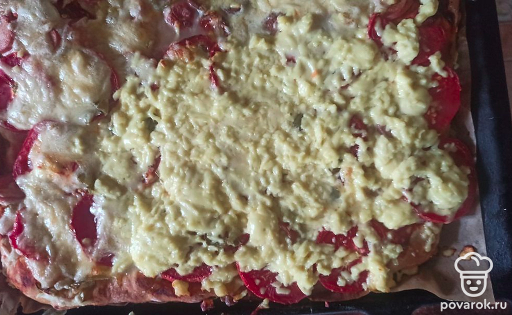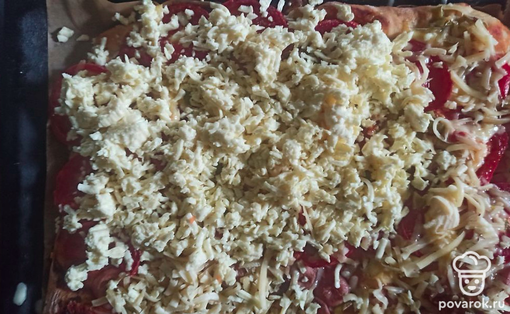 Поставьте в духовку при 180 градусах до готовности теста. Посыпьте сверху тертым сыром.