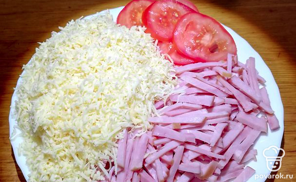 Ветчину нарезать брусочками, помидоры слайсами, а сыр натереть на мелкой тёрке.