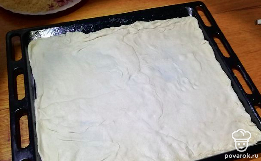 Тонко раскатать тесто, выложить на противень. У меня тесто покупное.