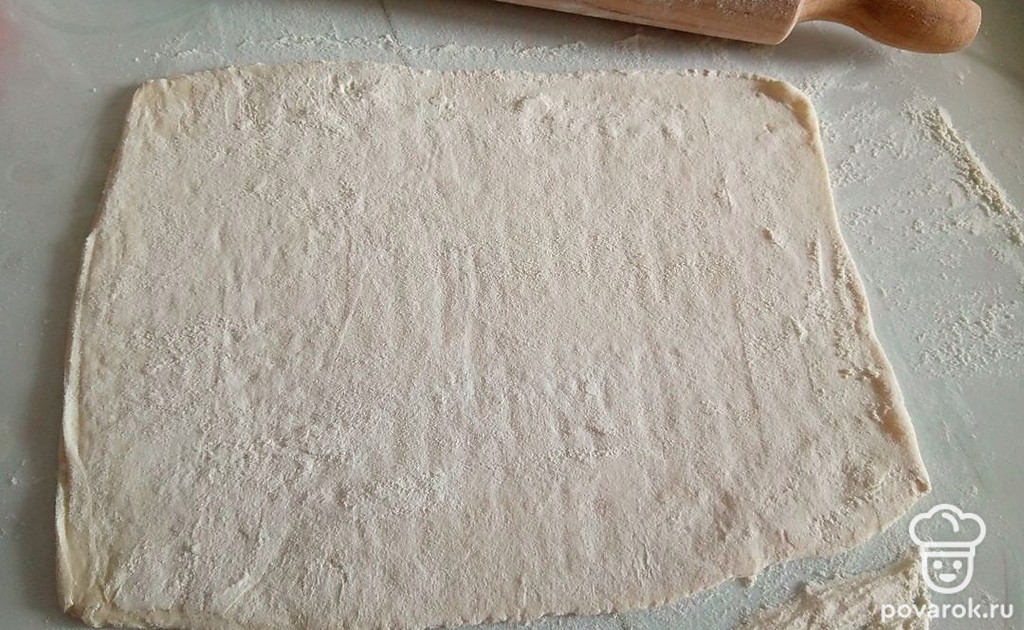 Тесто достаньте из морозилки заранее и раскатайте, присыпая мукой. Противень смажьте растительным маслом и выложите тесто.