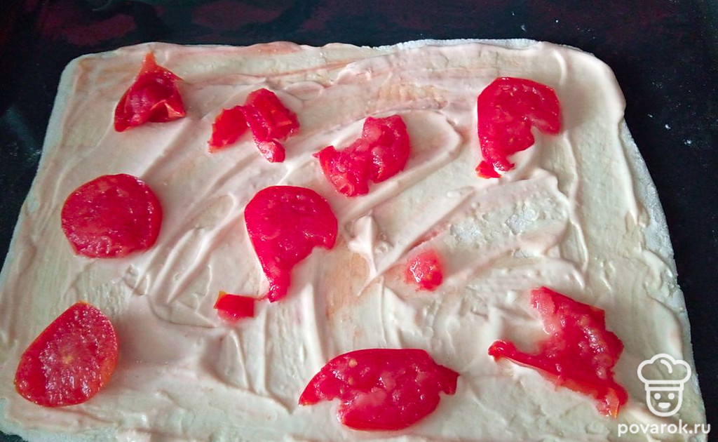 Смешайте кетчуп и майонез и смажьте тесто. Помидорку нарежьте и выложите на пиццу. Разогрейте духовку до 200 градусов.