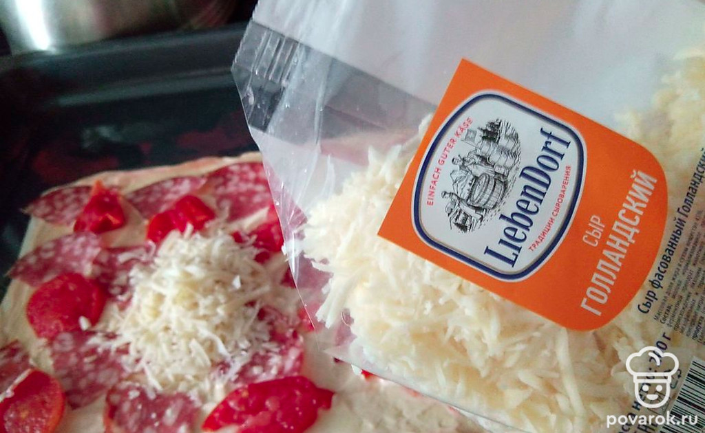 Разложите колбасу и посыпьте тертым сыром. Запекайте 12-15 минут. Пицца-минутка готова!