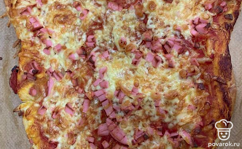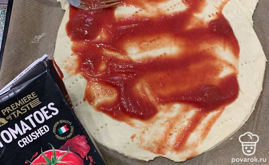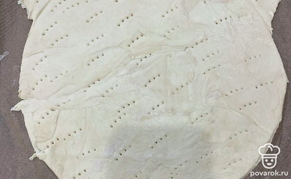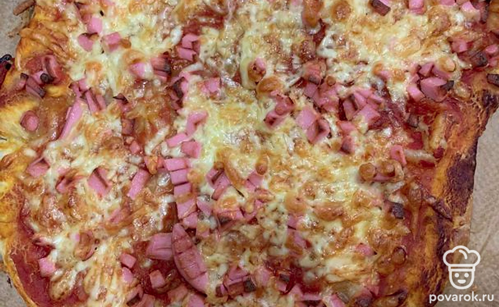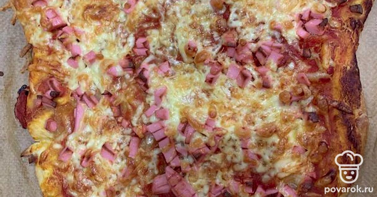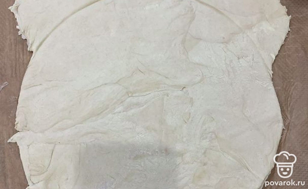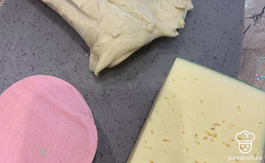 Разморозить тесто, раскатать. Подготовить любую начинку, у меня колбаса и сыр.