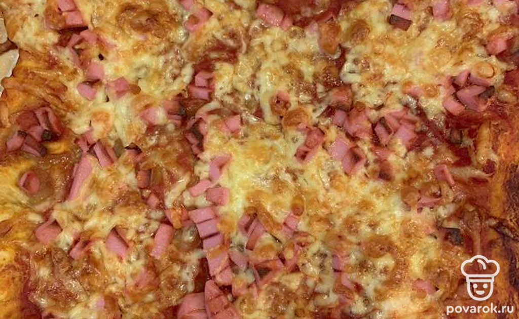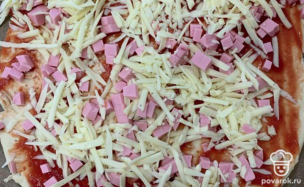 Колбасу нарезать кубиками, сыр натереть на терке, выложить на тесто.