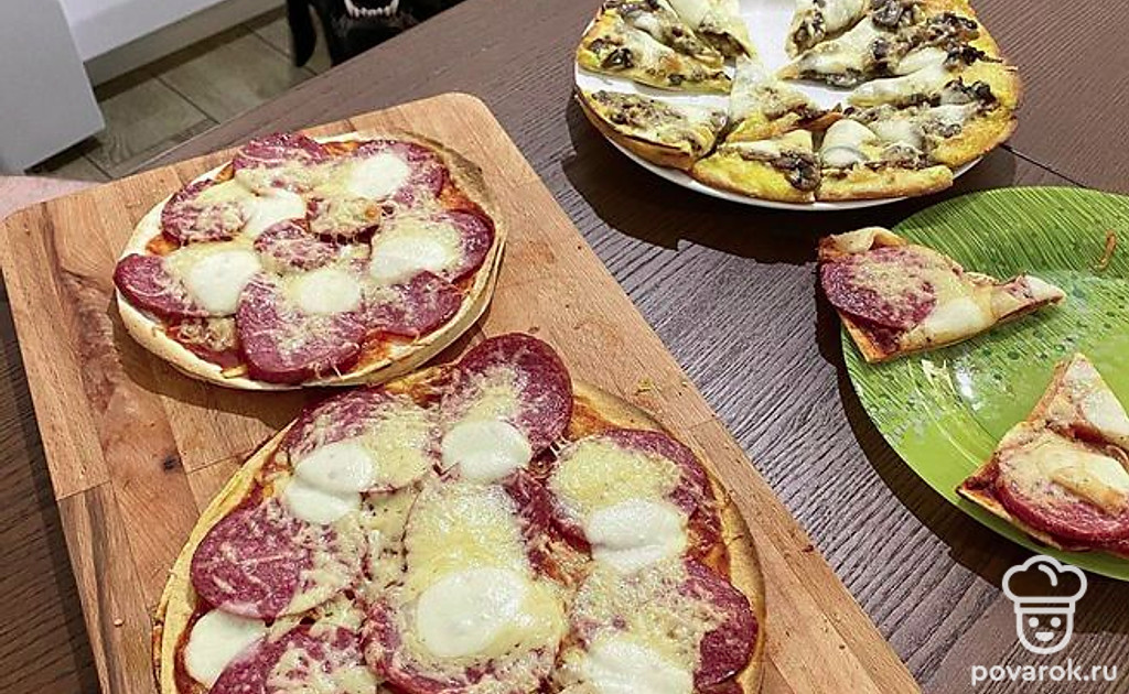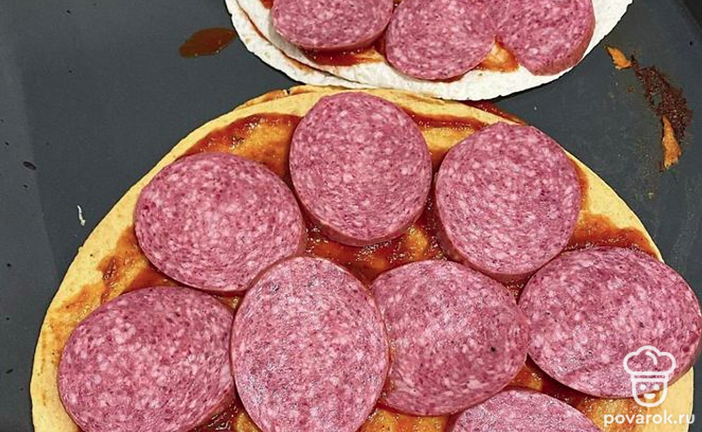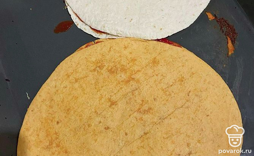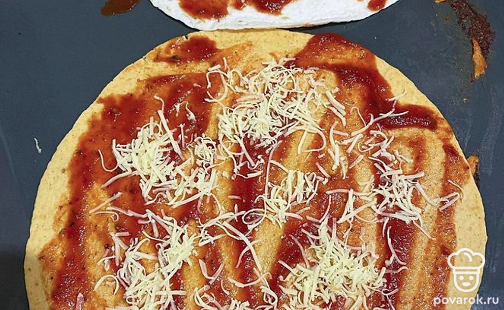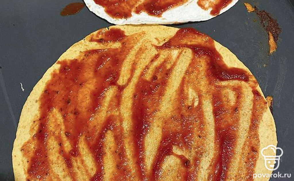 Из лаваша вырезаем круги диаметром 30 сантиметров и смазываем кетчупом один круг.