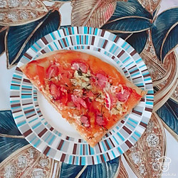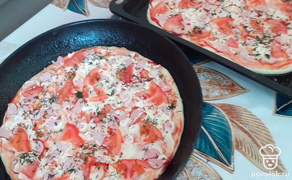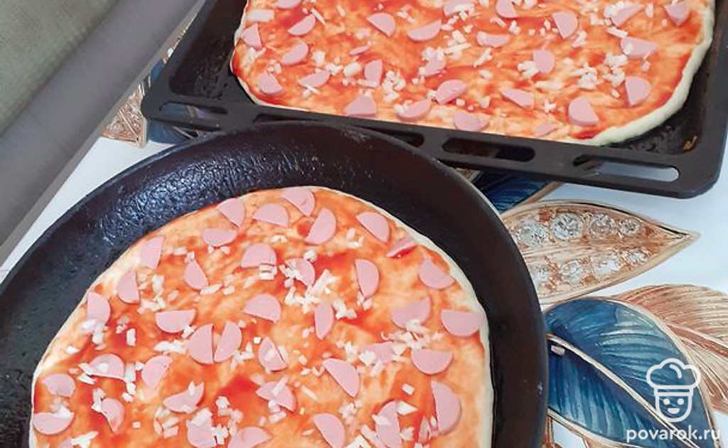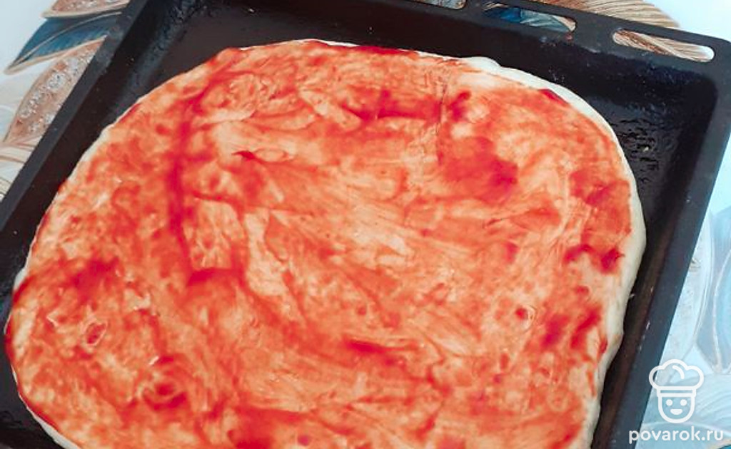 Этого теста мне хватило на 2 сковородки. Расстилаем и смазываем кетчупом.