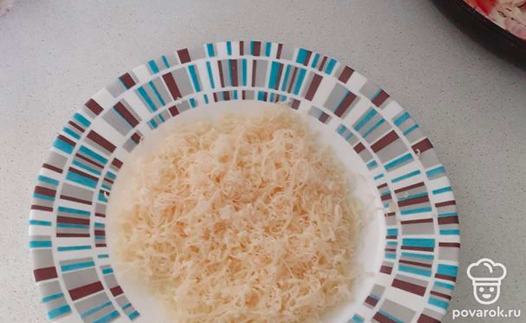 Пока пицца готовится, на мелкой терке натираем сыр.
