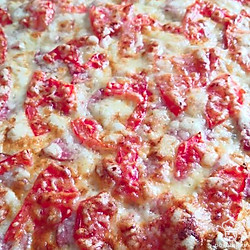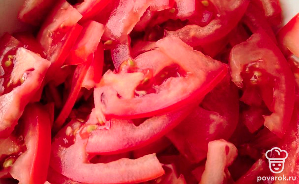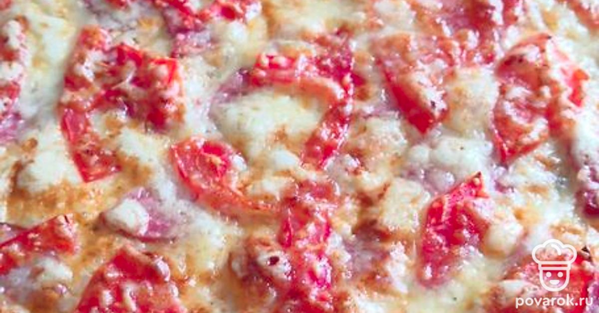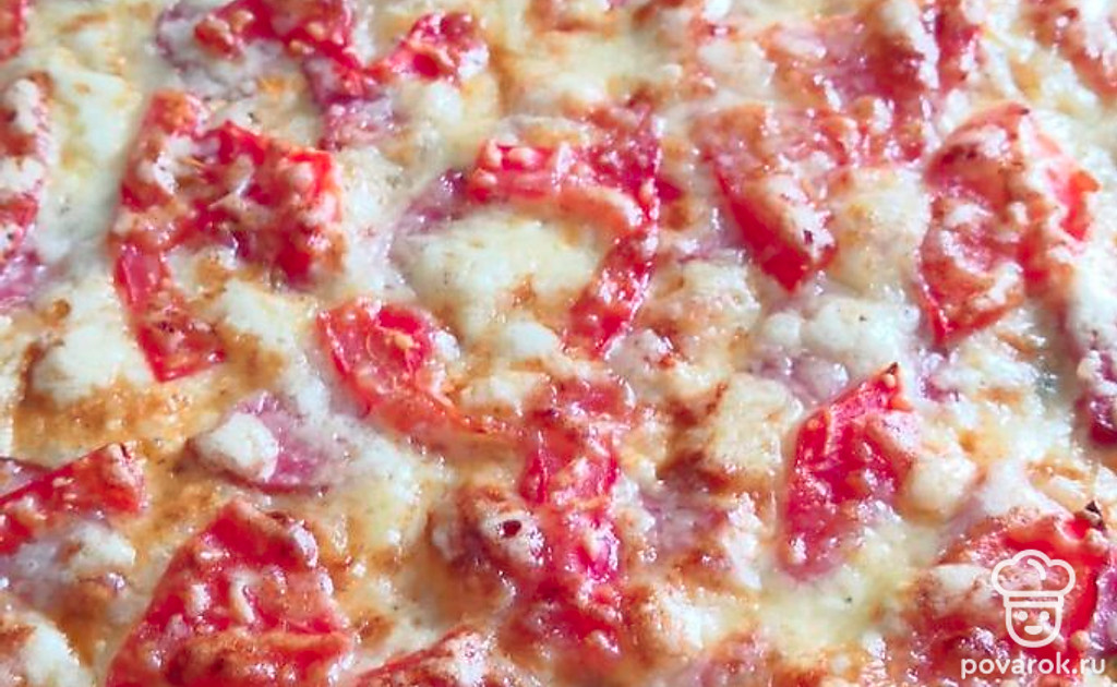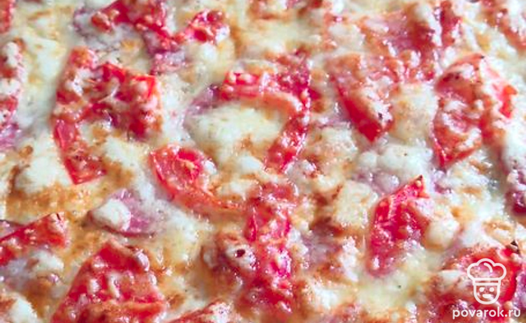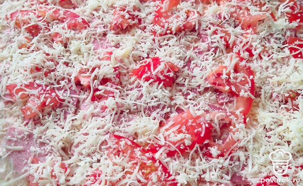 Выложить немного сыра, колбасу, помидоры и посыпать сверху оставшимся сыром.