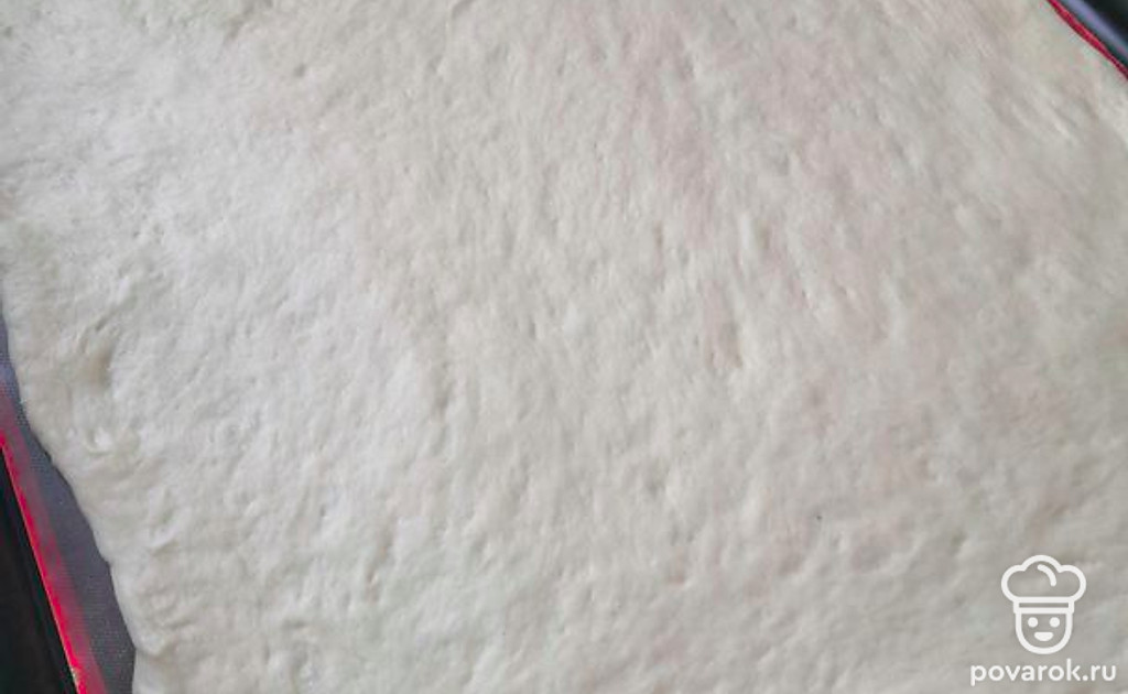 Тесто раскатать толщиной примерно 4-5 мм по размеру вашего противня (у меня 30х40). Если используется коврик для выпечки, то его можно не смазывать маслом.