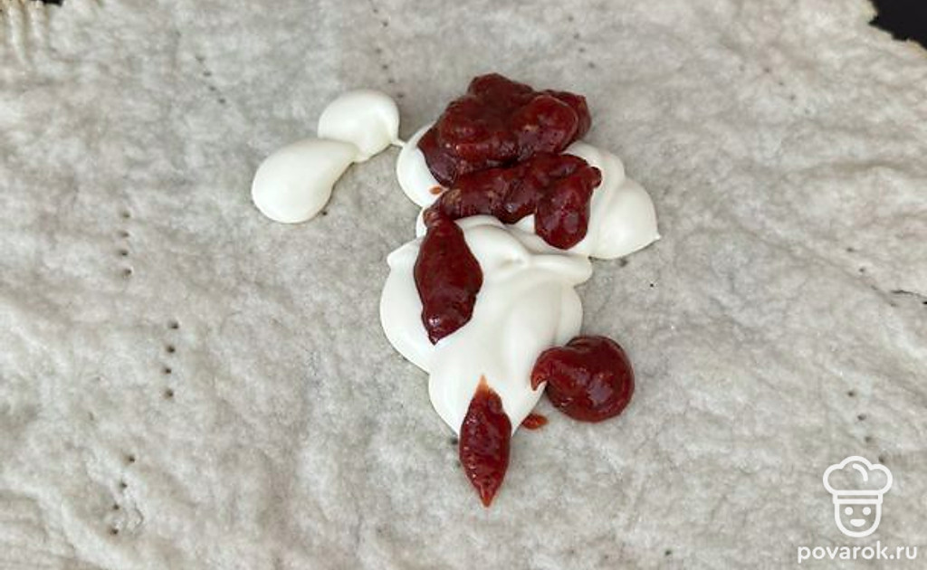 На основу добавить майонез и кетчуп, распределить.