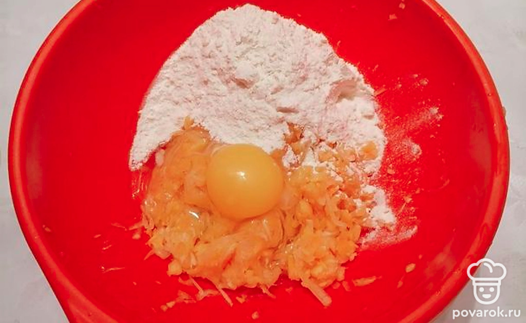 Натереть кабачок на крупной тёрке, посолить, отжать сок. Добавить яйцо, муку и перемешать.