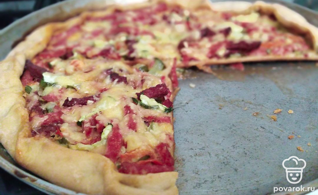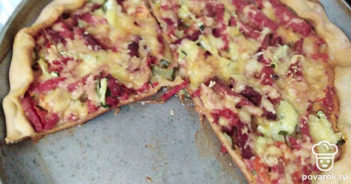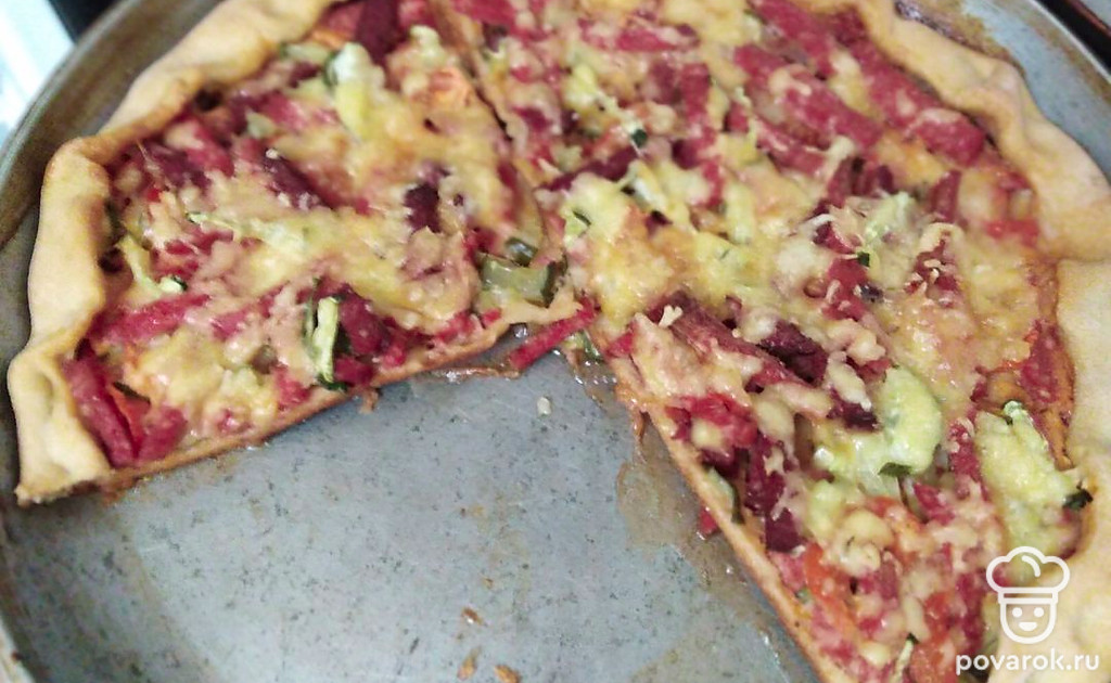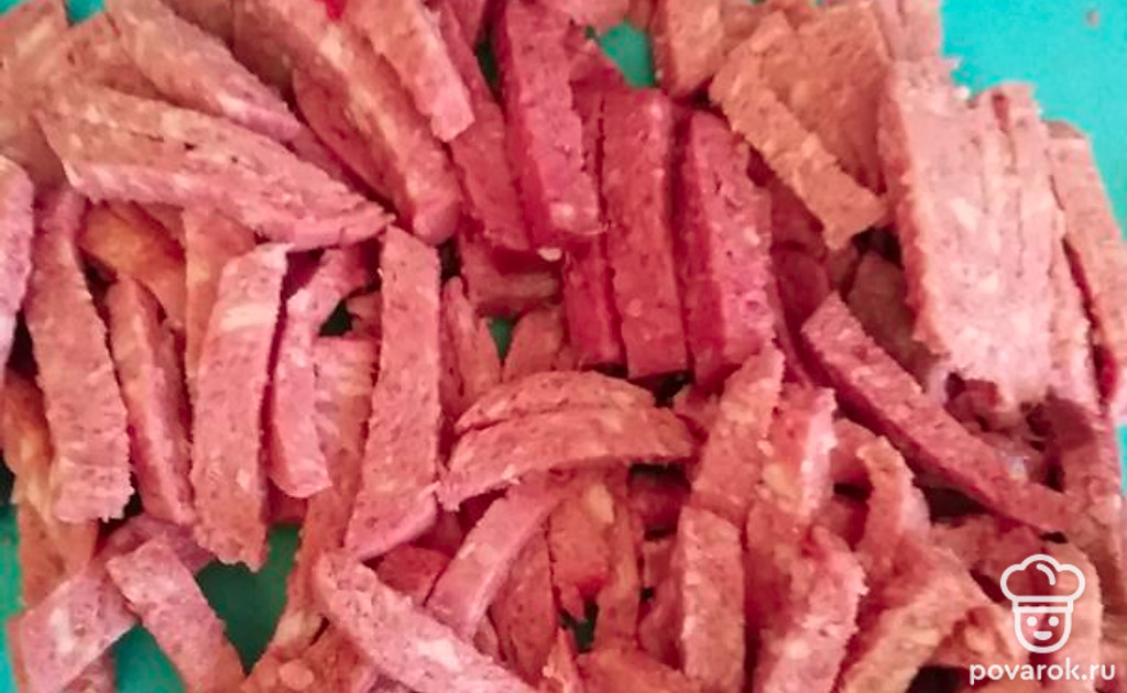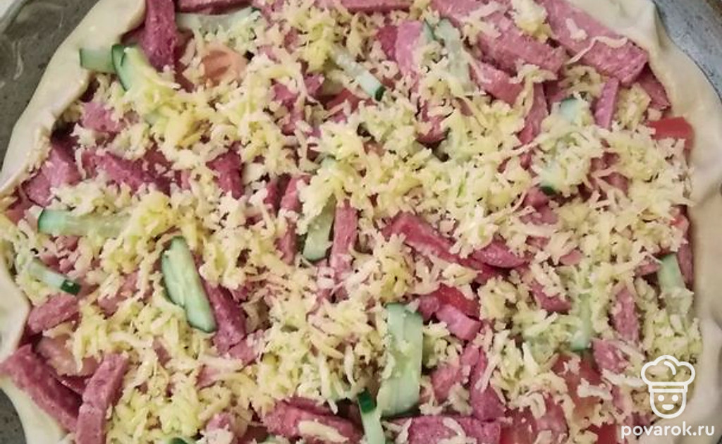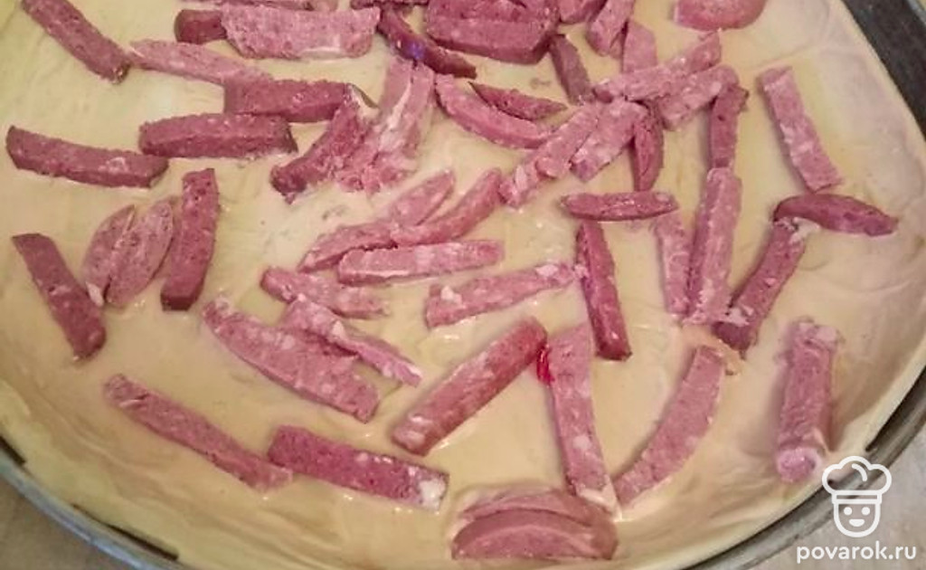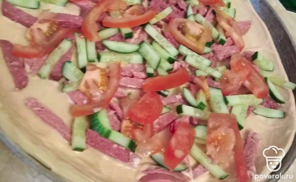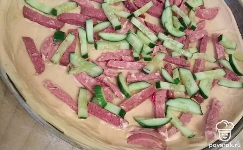Начинаем раскладывать начинку. 1 слоем кладём колбасу.