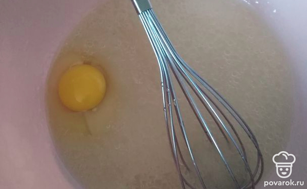 Начните с теста. Для этого надо взять большую ёмкость, чтобы было удобно смешивать. Положите 1 маленькую кружку воды, соль, сахар, яйцо. Перемешайте.