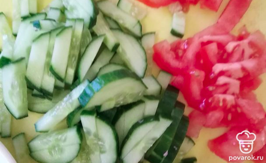 Пока наше тесто отдыхает, начинаем готовить начинку. Помойте огурец и помидоры и нарежьте ломтиками.