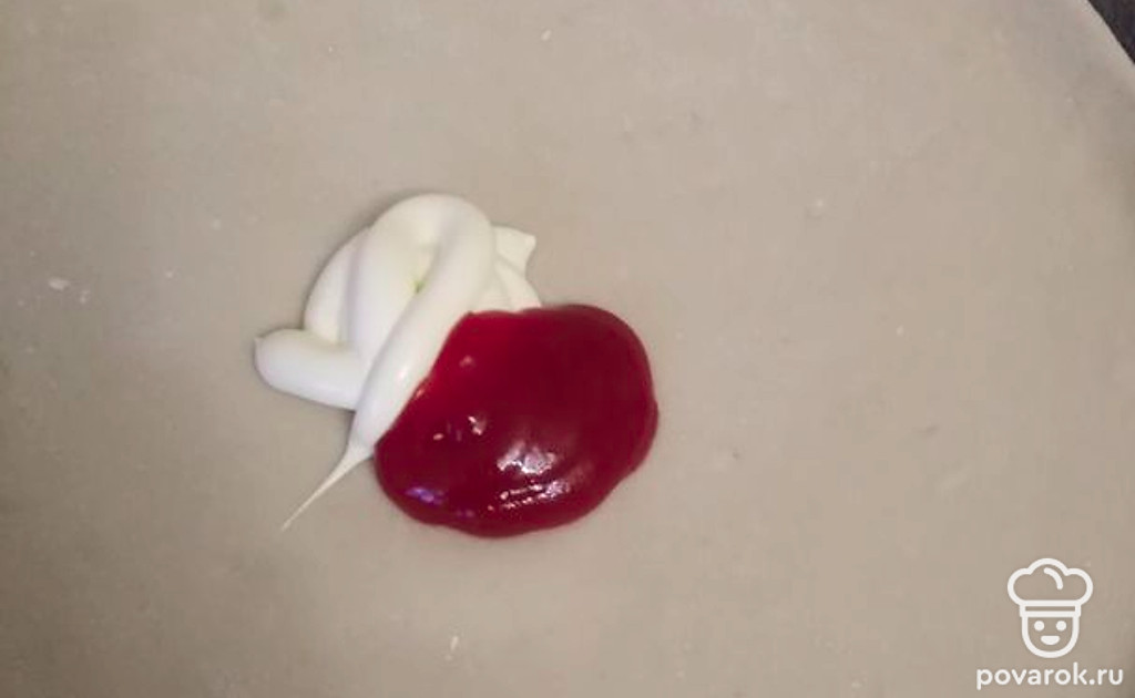 Смажьте тесто кечунезом, добавив кетчуп и майонез.