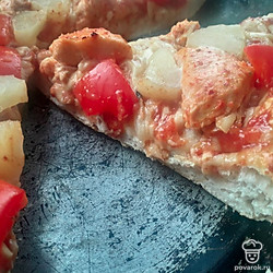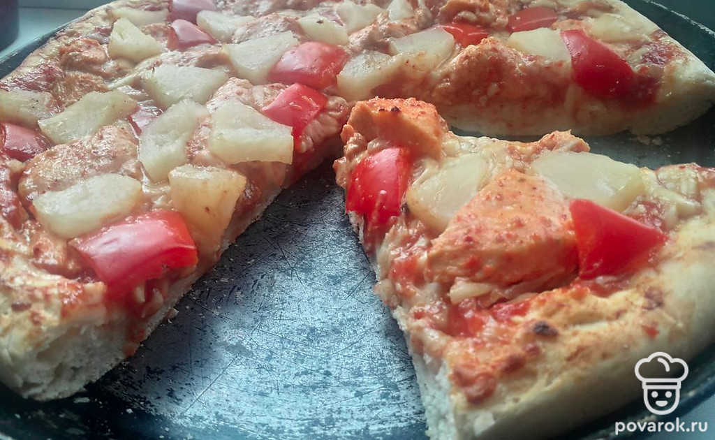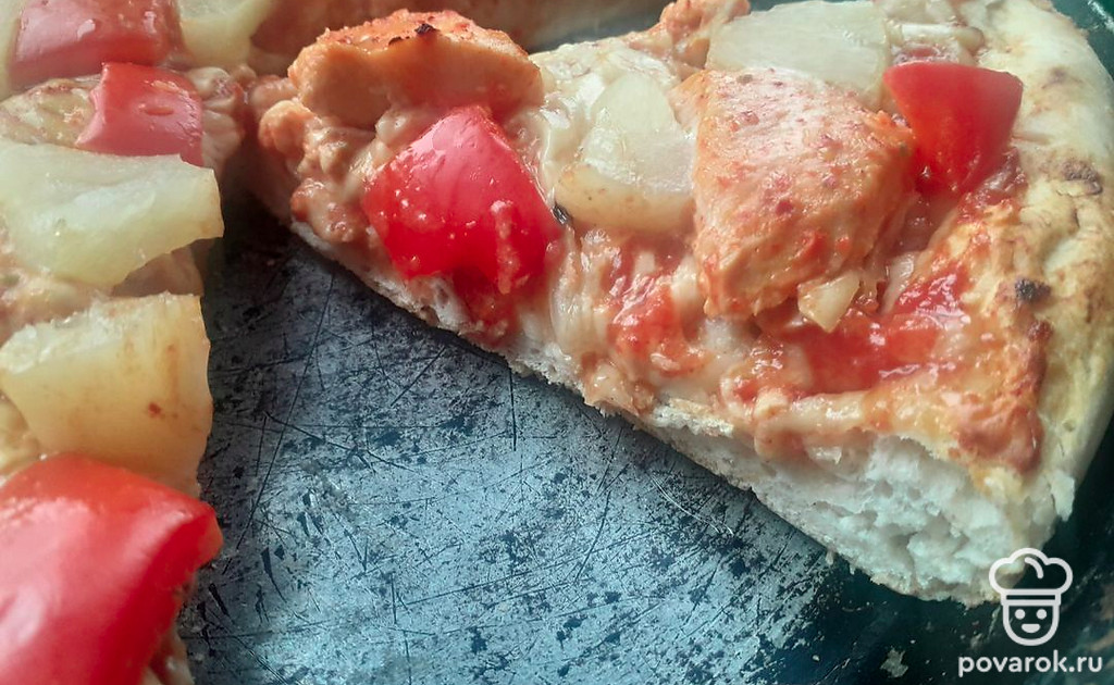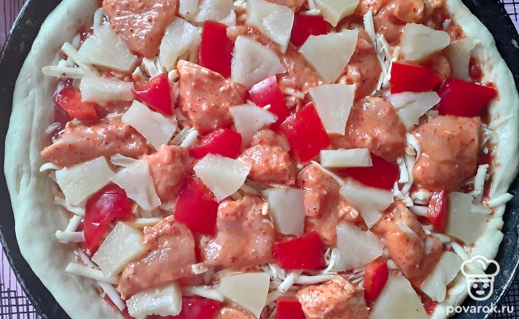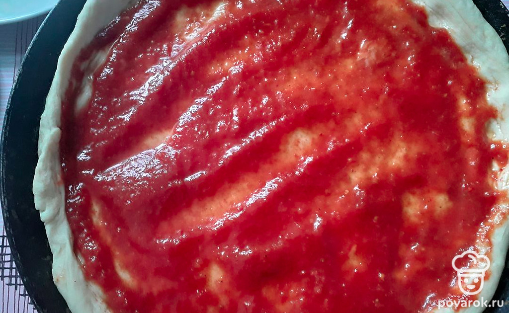 Раскатайте тесто и выложите в форму, смажьте соусом или кетчупом. Если любите поострее, добавьте перец чили или аджику.