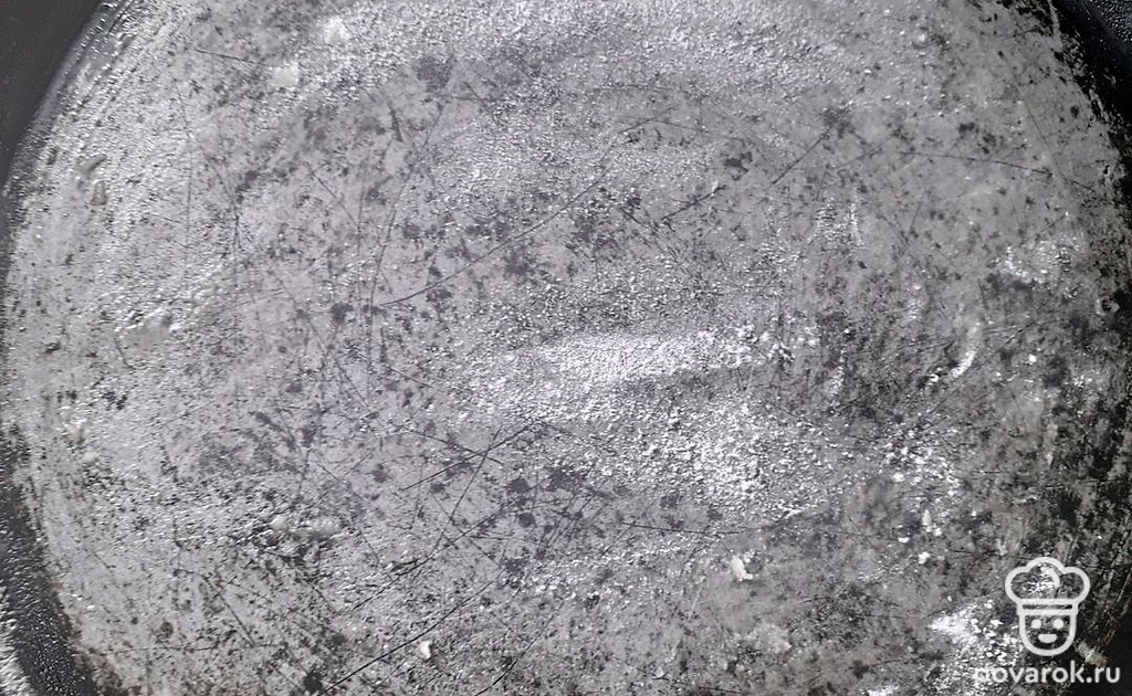 Подготовьте сковороду, смажьте ее растительным маслом и присыпьте мукой.